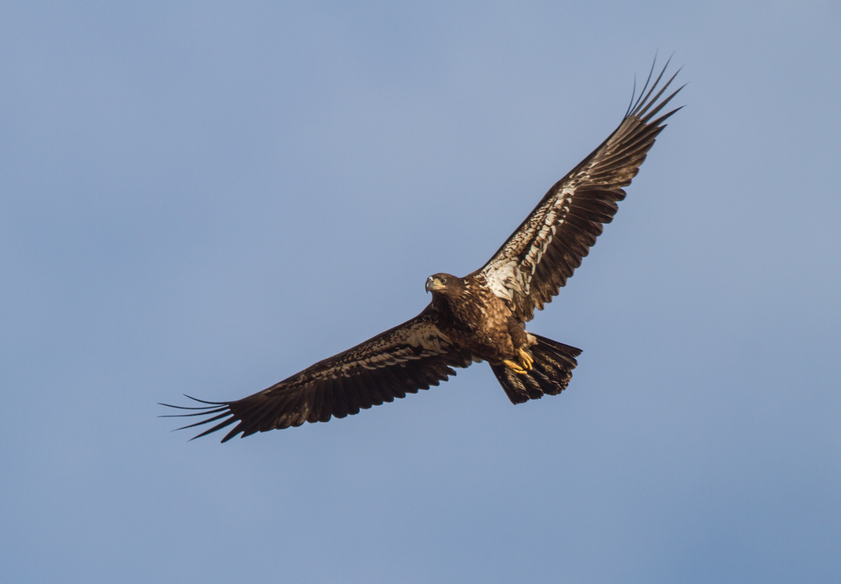 I soon encountered the Black Bear and Raccoon from my previous post and spent a couple of hours watching things in the trees instead of the sky. But I finally I headed back out to the fields to see what was going on. There were several eagles perched in trees around the field edges. A couple of people were now walking on the road, and they spooked a couple of the eagles, one of which flew close by me for a nice look. It was an immature Bald Eagle, recognized by the mottled whitish “arm pits” as it flew over my head.