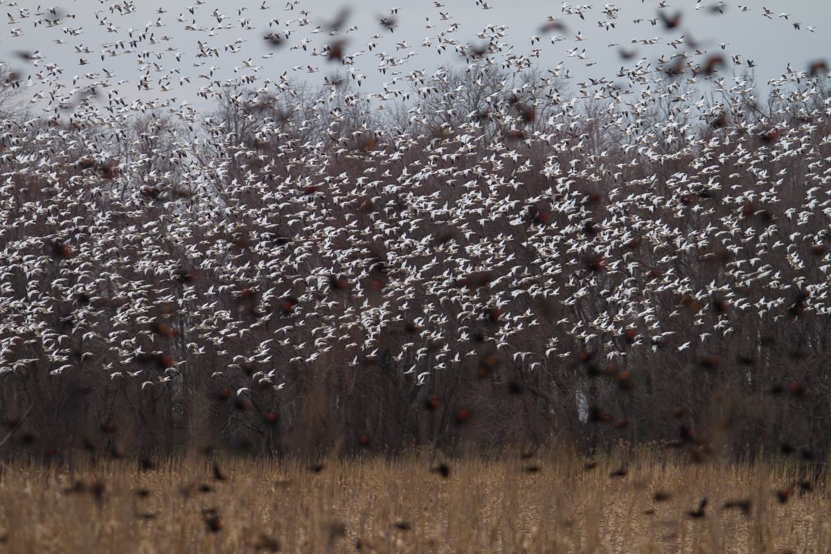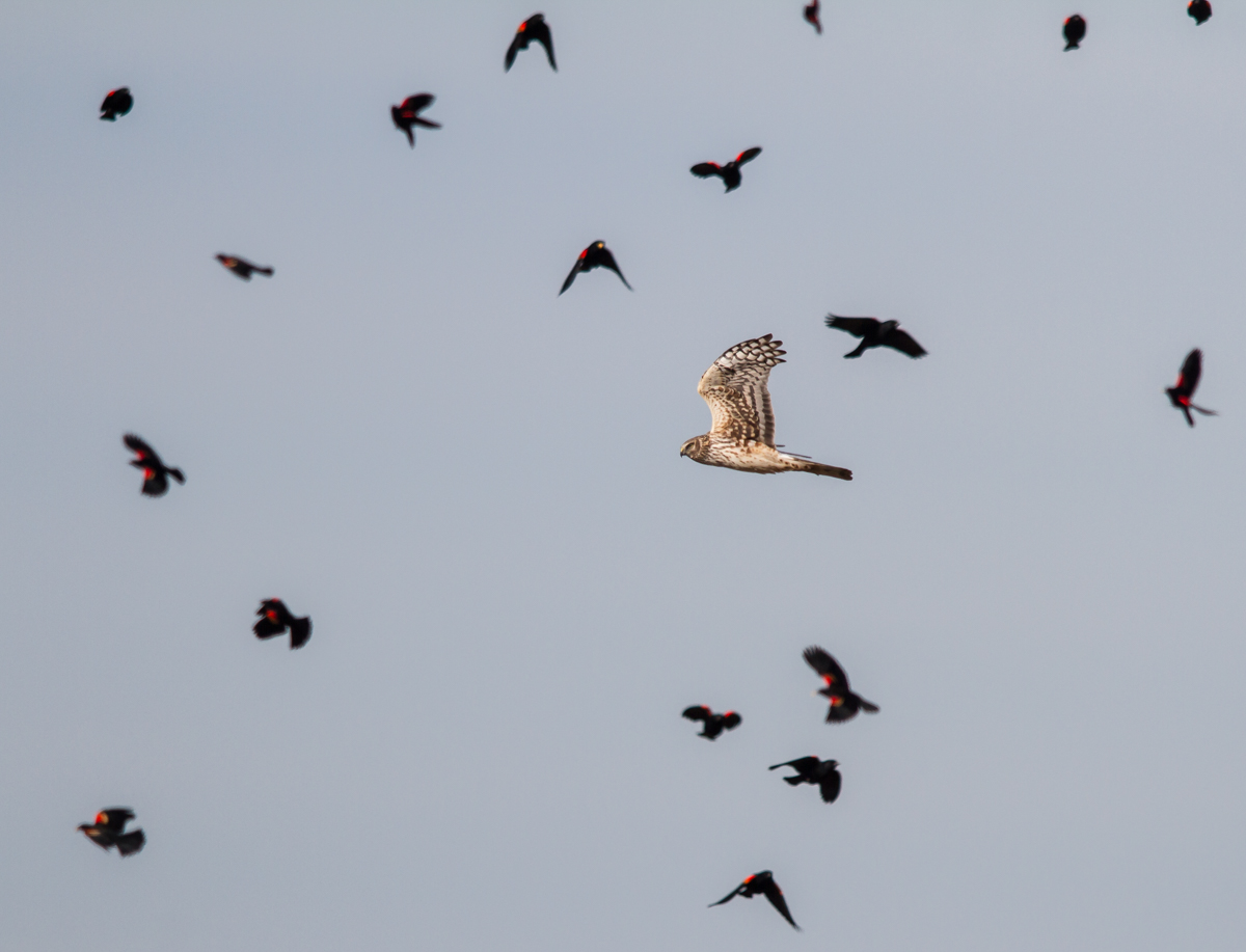 Now a new flock was added to the aerial commotion – Red-winged Blackbirds. The sky was soon a swirl of tiny black spots and noisy white blobs.
