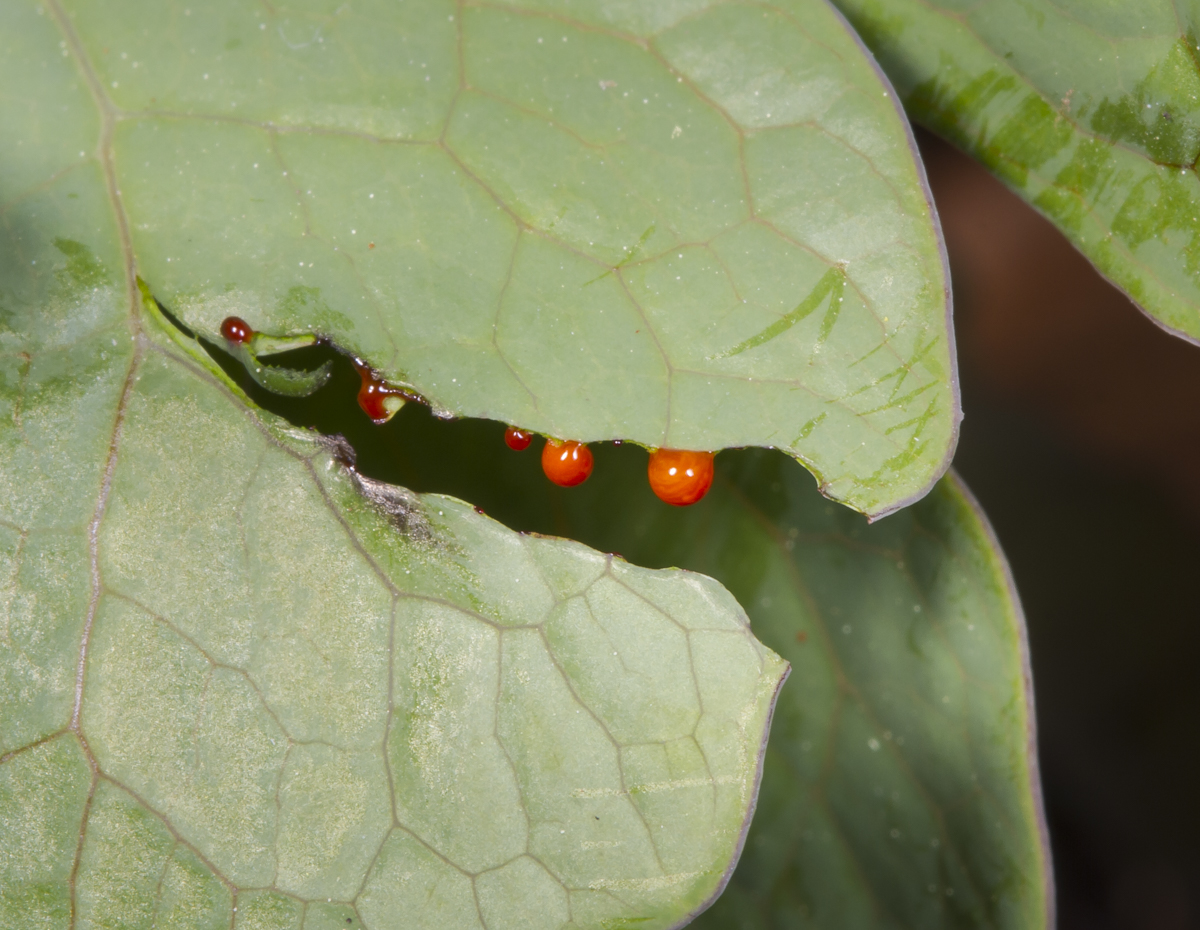 All parts of the plant contain these compounds and if you gently cut a leaf, it appears to bleed an orange-red blood form the severed veins. While it seems this might protect the plant from being eaten, I cannot find any of these beautiful flowers outside my deer fence.
