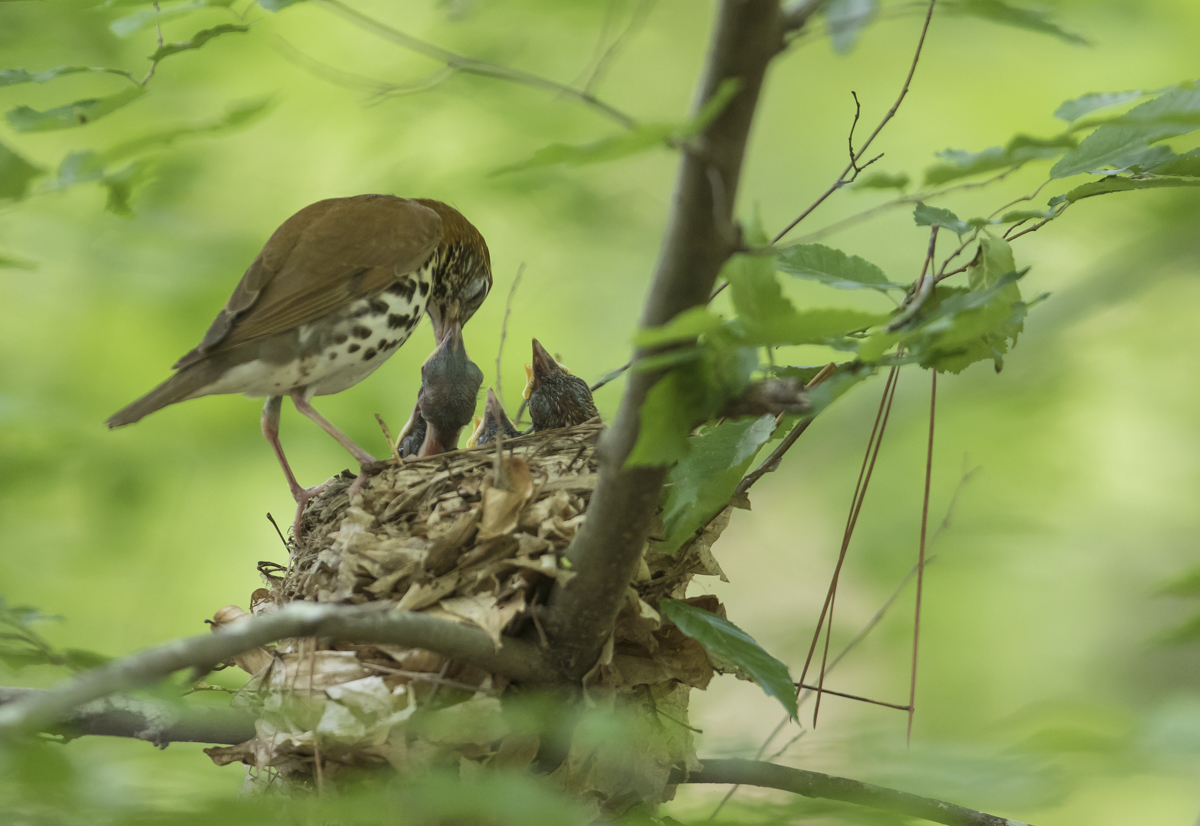Most of the time I observed the nest, one of the adults was sitting nearby. This seemed like a good strategy given the number of potential threats in these woods – American Crows, Blue Jays, Black Rat Snakes, Raccoons, Gray Squirrels, feral or neighborhood cats…the list was pretty long. I did see one of the adult Wood Thrush harassing a Blue Jay that approached within about twenty feet of the nest. When it finally left, the Wood Thrush pair stayed off the nest for several minutes and then came back, checked on things, and resumed their feeding. The typical pattern was for one of the birds to be on or next to the nest until the other adult was in view with more food, then it would fly off to forage while the other bird fed the young.