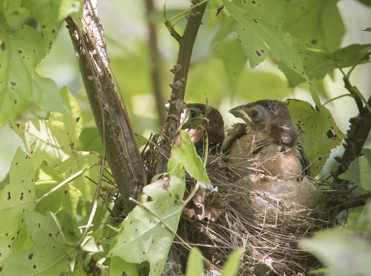 As I watched, I could finally make out the heads of four nestlings, but two of them clearly dominated the space in the nest, and seemingly the food items brought in by the parent birds. Unfortunately for me, the adult birds always brought the food in after landing in the same location on the far side of the nest, which was partially obscured by the two upright branches. They were also very fast in their food transfer, which made it tough to see what they were bringing to their young. During the two hours I was hidden in the camouflage netting, I observed 20 feedings. Of those where I could see a prey item, all were caterpillars of some sort. Here is an example of one of the quick feeding bouts: