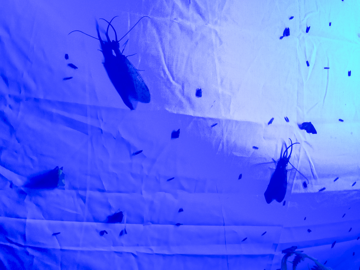 The set up is simple: I stretched a cotton sheet between two step ladders (most people hang a line between two trees), clamped the sheet to the ladders, hung the light on a tripod handle, and placed the tripod in front of the sheet. I then went inside and checked on the sheet periodically over the next couple of hours.