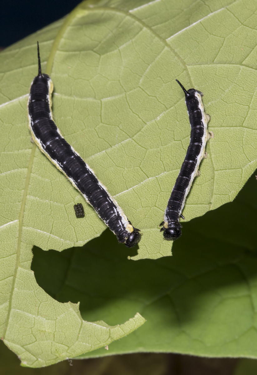 And, like most caterpillars I have seen, these guys are eating machines. In the short time I was photographing them, just a few managed to consume about half of one of the large leaves I collected. And when they eat, they poop (you can see some frass, caterpillar poop, in the first photo of this pair). So, if you are standing under a large Catalpa tree having perhaps hundreds of large caterpillars up in its branches, I suppose it can sound like rain pouring down. Caterpillars eventually climb down the tree trunk and pupate in the ground nearby. And, surprisingly, it is common to have two or more generations in a season.