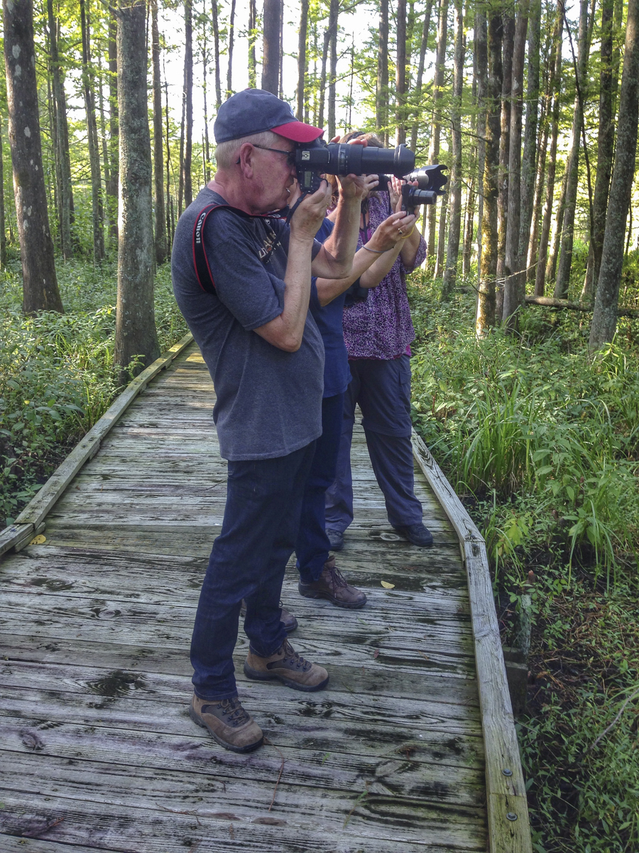 We decided to run over to nearby Mattamuskeet NWR to see what else we could see. There were the usual waders, Great Egrets and Great Blue Herons, plus lots of turtles in the canals. People were catching Blue Crabs in several places (a very popular summer activity at this refuge). But, after driving the length of Wildlife Drive, no foxes or other wildlife were seen. We stopped to walk the short boardwalk through the swamp as it is one of my favorite hikes at Mattamuskeet. It was made more appealing on this afternoon due to the shade. As is often the case when I am leading a group, I left my camera in the car. My goal is to find things for the clients to observe and photograph, plus I always joke that by leaving my camera behind, it increases our chances of seeing something interesting. Well, it did not disappoint.