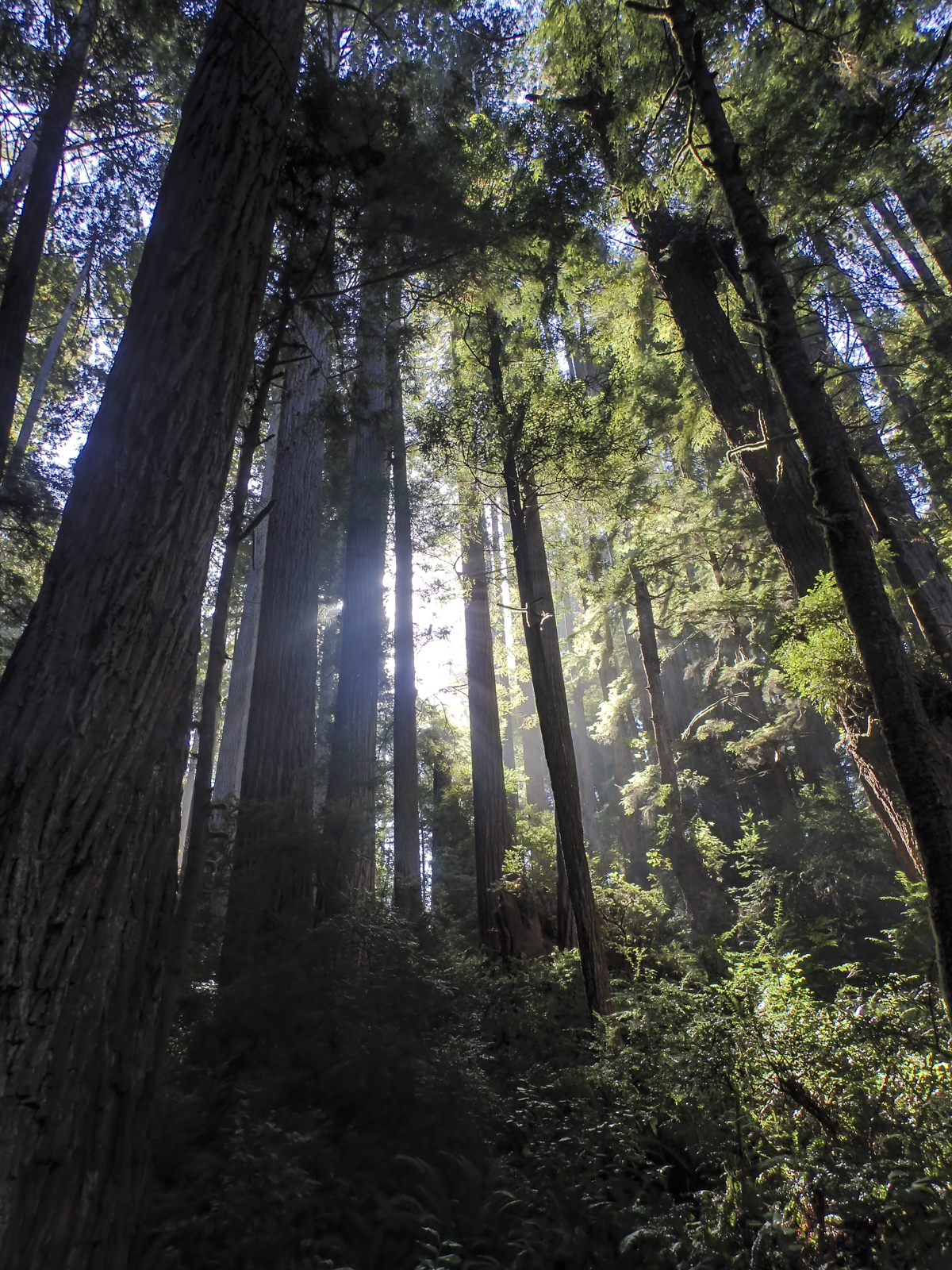 Sunlight streams through the giant trees at Prairie Creek Redwoods State Park