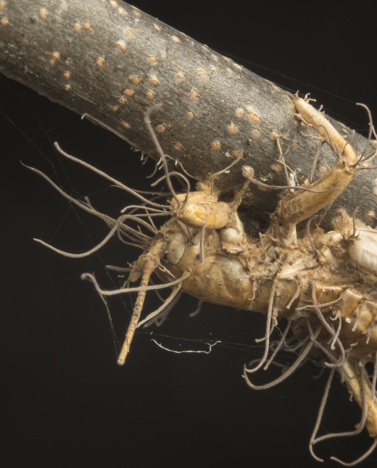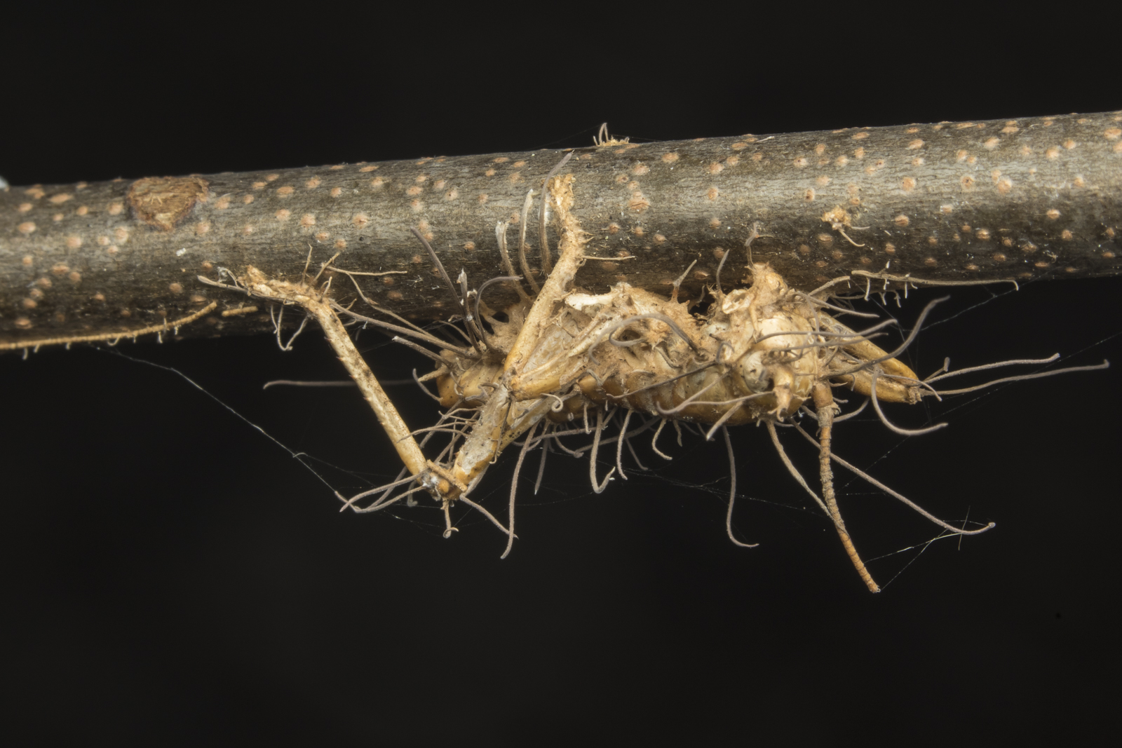 Within a few days after infection, the host insect begins to behave differently due to chemicals secreted into its brain by the invading fungus. Studies have shown that ants infected by one species of zombie fungus tend to crawl up on vegetation and lock onto a leaf with their mandibles. They soon die and stalk-like structures grow out of the ant to release spores. By altering the behavior of the ant, by making it climb up off the ground and attach its soon-to-be-dead body to the vegetation, the fungus ensures its spores are released in an environment favorable to their dispersal. The same is probably true of my dead cricket. It has been manipulated into a good spore-release position on the underside of a twig a couple of feet above the ground. The cricket appears to be fixed in place by another mechanism seen in body-snatching fungi. Specialized hyphae burst through the legs and and other body parts to anchor the hapless host to the twig.