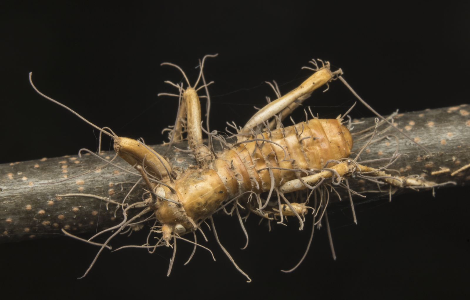 As if all this seemingly alien biology isn’t strange enough, I also came across some cultural references to this phenomenon. One item mentioned the medicinal value of a Cordyceps fungus from high elevations of the Tibetan Plateau in Asia. C. sinensis has been used for centuries in Chinese medicine for conditions ranging from fatigue to ailments of various organs such as the kidney, heart, and lungs. It is one of the rarest and most expensive forms of Oriental medicine because of its highly specific growth environment and restricted geographical range. The fungus grows from the head of one species of infected caterpillar that burrows into the soil in these alpine environments. I was puzzled as to how it could be collected for medicinal use until I saw some photos online. Unlike my cricket’s thread-like projections, C. sinensis grows to lengths of a few inches and looks more like your little finger in overall size. Wild collected fungi sold in 2008 for as much as $30,000 per pound in places like San Francisco. There are now means of artificially cultivating the fungus and research is underway to verify its value for treating many diseases, including some forms of cancer.