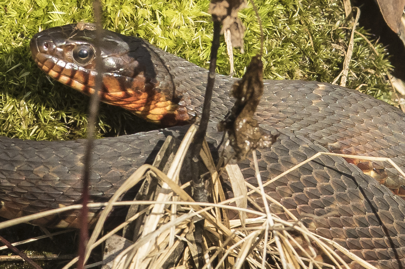 The more I looked, I thought maybe it was a Banded Water Snake, Nerodia fasciata, which can be rather dark on its dorsal surface, but can retain faint bands, like this one appeared to have. They usually have a diagnostic dark stripe from the eye to the back of the jaw line, and this one might have that, although it is hard to see. So, not quite sure, but snake species #2 for the day, nonetheless.