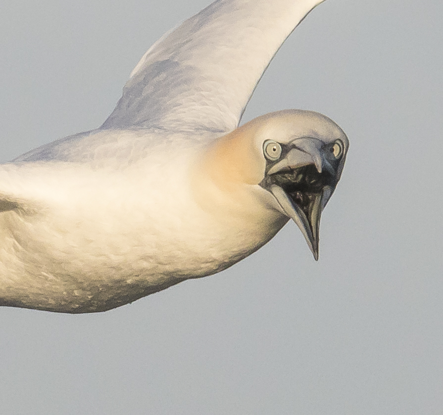 One of the great highlights of the trip for me was being able to observe the gannets up close. It is only then that you can clearly see and appreciate the subtle colors of the adult bird’s head. The piercing eyes are lined with a light blue. The large, pointed bill is a blueish-gray color with black lines that outline it, the eye, and extend beyond the gape of the bill onto the neck. The head is tinged in a buff or gold color that varies among individual birds. Gannets have no external nostrils. Close inspection shows a slit-like opening near the base of the bill covered by a flap, which is forced shut over the opening when the bird plunges into the water.