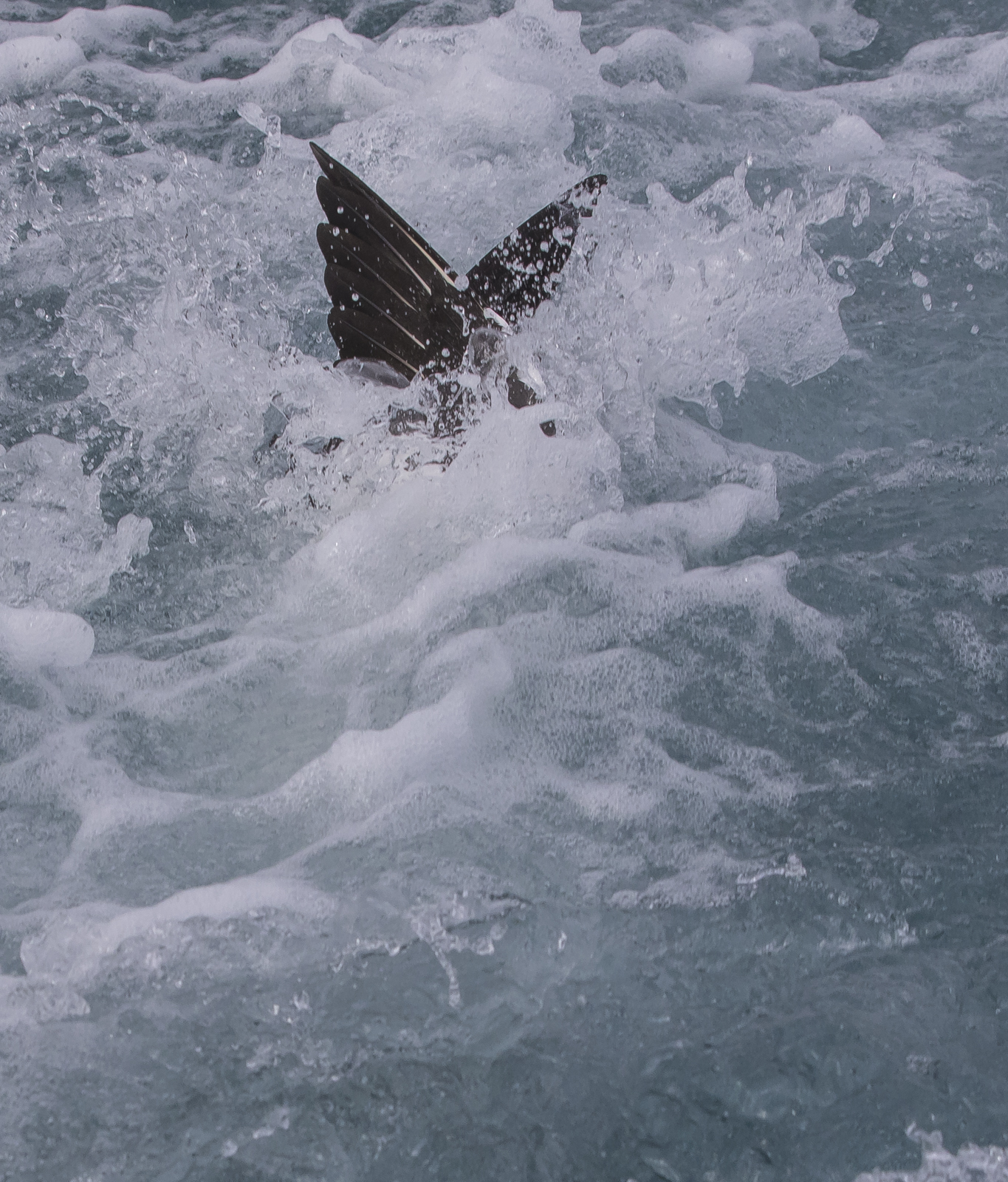 Wings folded back against body as the bird hits the water like a feathered spear thrown by the clouds