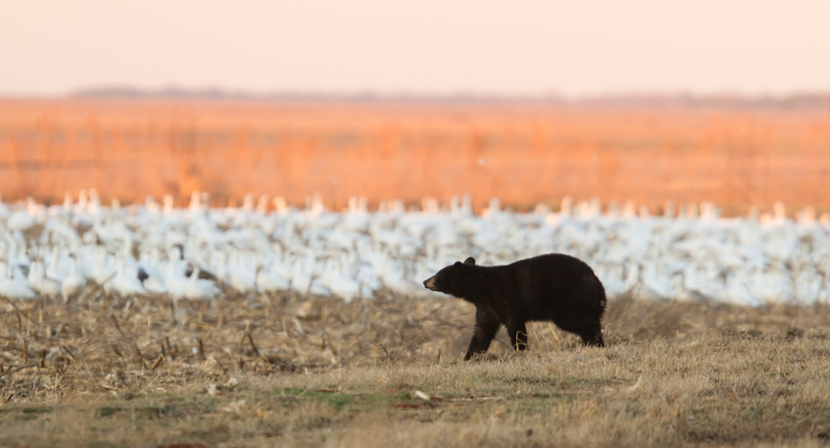 When we pulled up to the gate at “Bear Road” we could see and hear thousands of swans and snow geese flying to and from the lake, landing in the fields to feed on the corn. It was only then I realized the driver of the other vehicle, Rick, got out into a wheelchair. The usually muddy road was frozen, so he was able to go down the road with some help from his friend, Ken. Everyone was in awe of the spectacle. It was about as good as Pungo gets. A couple of bald eagles flew out across the field sending the flock of snow geese into the air in a raucous swirl of wings. A few minutes later, two black bears wandered out from the nearby trees. We watched as the setting sun lit the sky in fiery colors and thousands of birds lifted off to return to the safety of the lake for the night. We all knew we had witnessed something special, something magical.