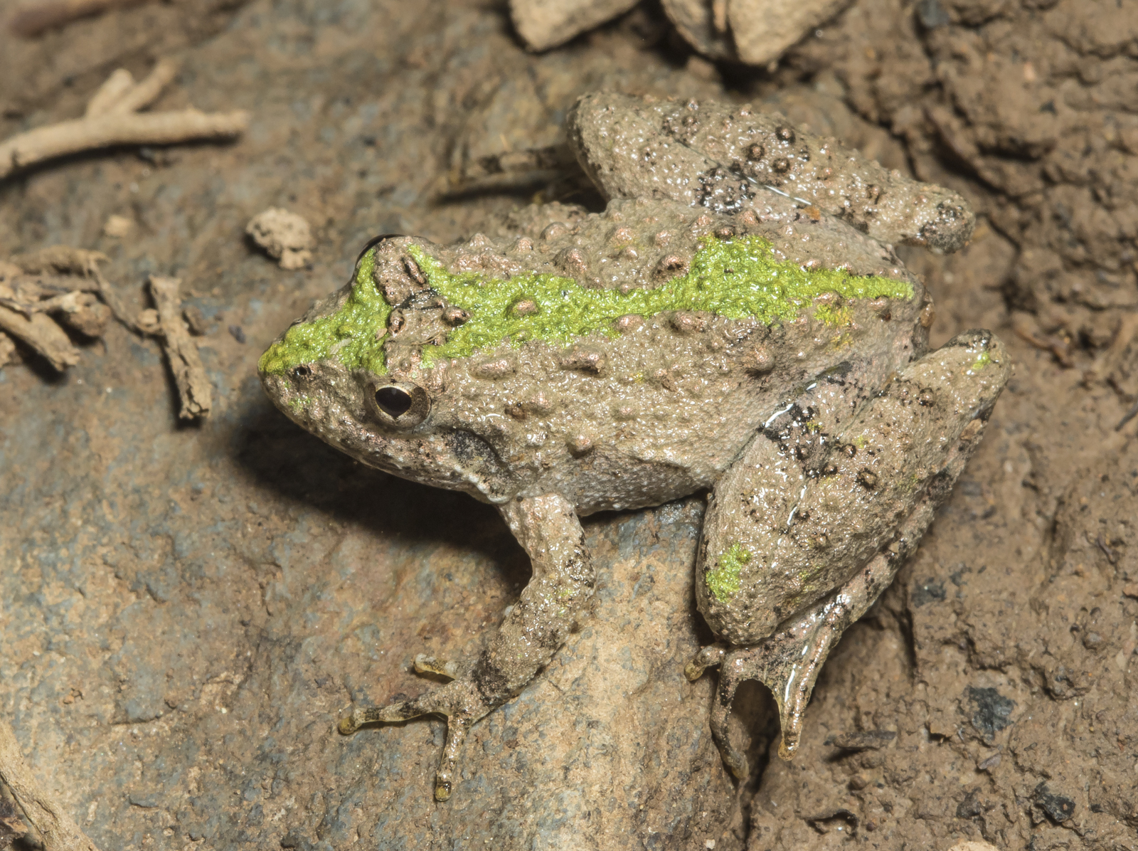 A few yards away, I came upon another cricket frog, this one with a noticeable green coloration in the dorsal Y-pattern. I looked up the topic of their color variation and stumbled on a host of scientific papers dealing with this phenomenon in cricket frogs, known as color polymorphism. Various theories have been proposed and tested throughout the range of this species. And they have come up with various reasons for the color differences: visual selection by predators directly determines color proportions (the theory being that those that blend in better with the local surroundings are better concealed and therefore survive better); another thought some color morphs correlated better with local substrate color but are more resistant to desiccation in certain habitat types; and yet another study disagreed and suggested natural selection may favor some behavioral characteristics associated with a particular morph.