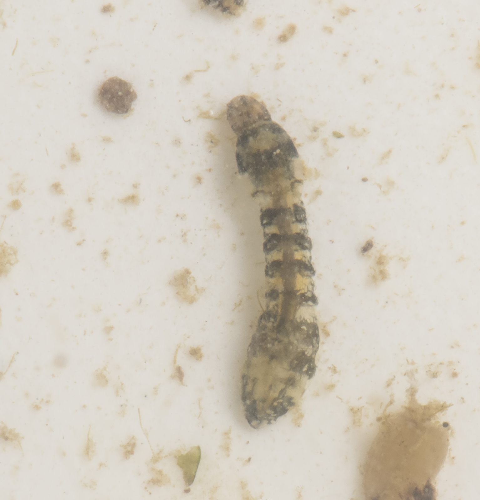 A few of our samples contained some of the distinctive fly larvae. The larvae produce a silk pad and then attach to it with tiny hooks on the tip of their abdomen.