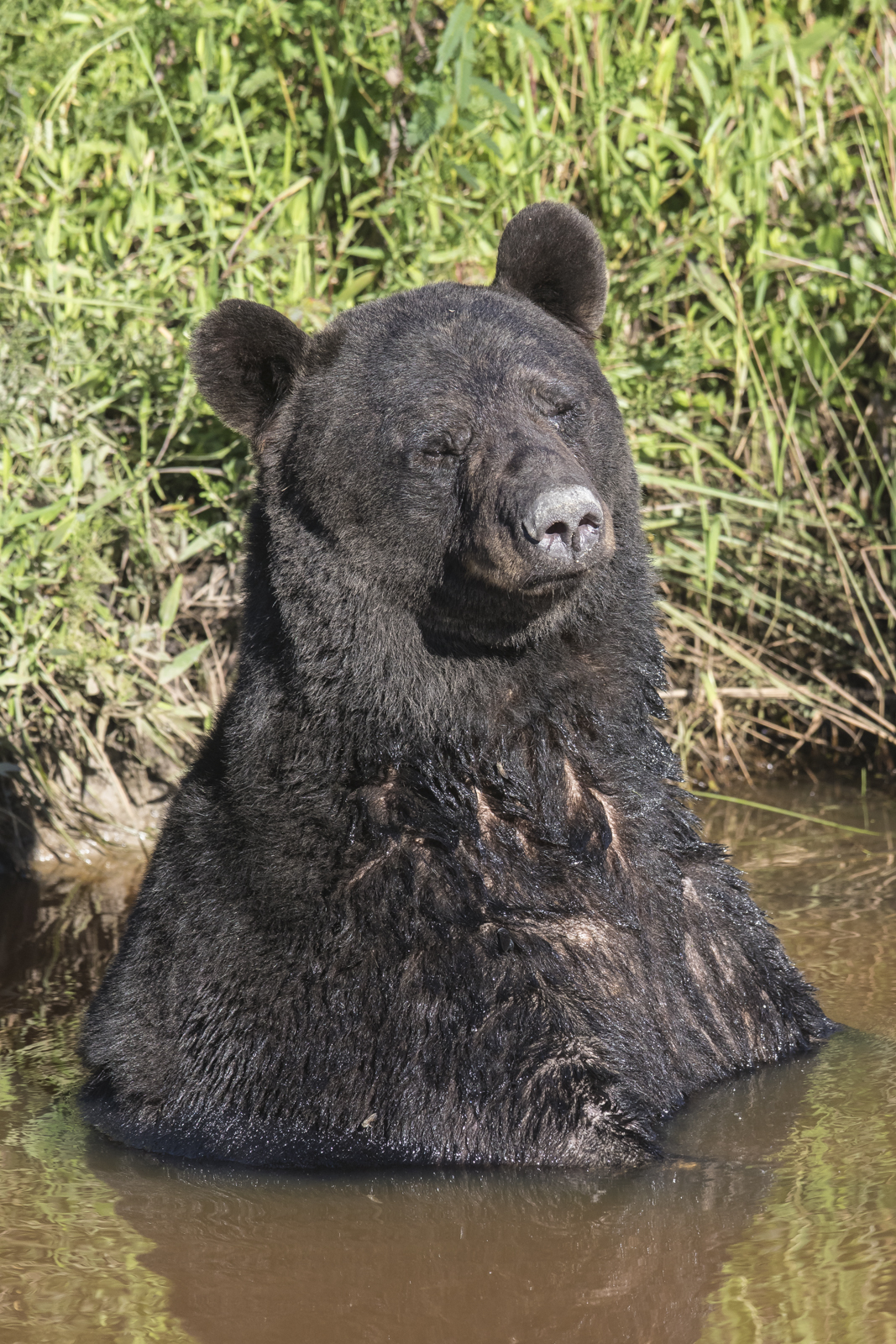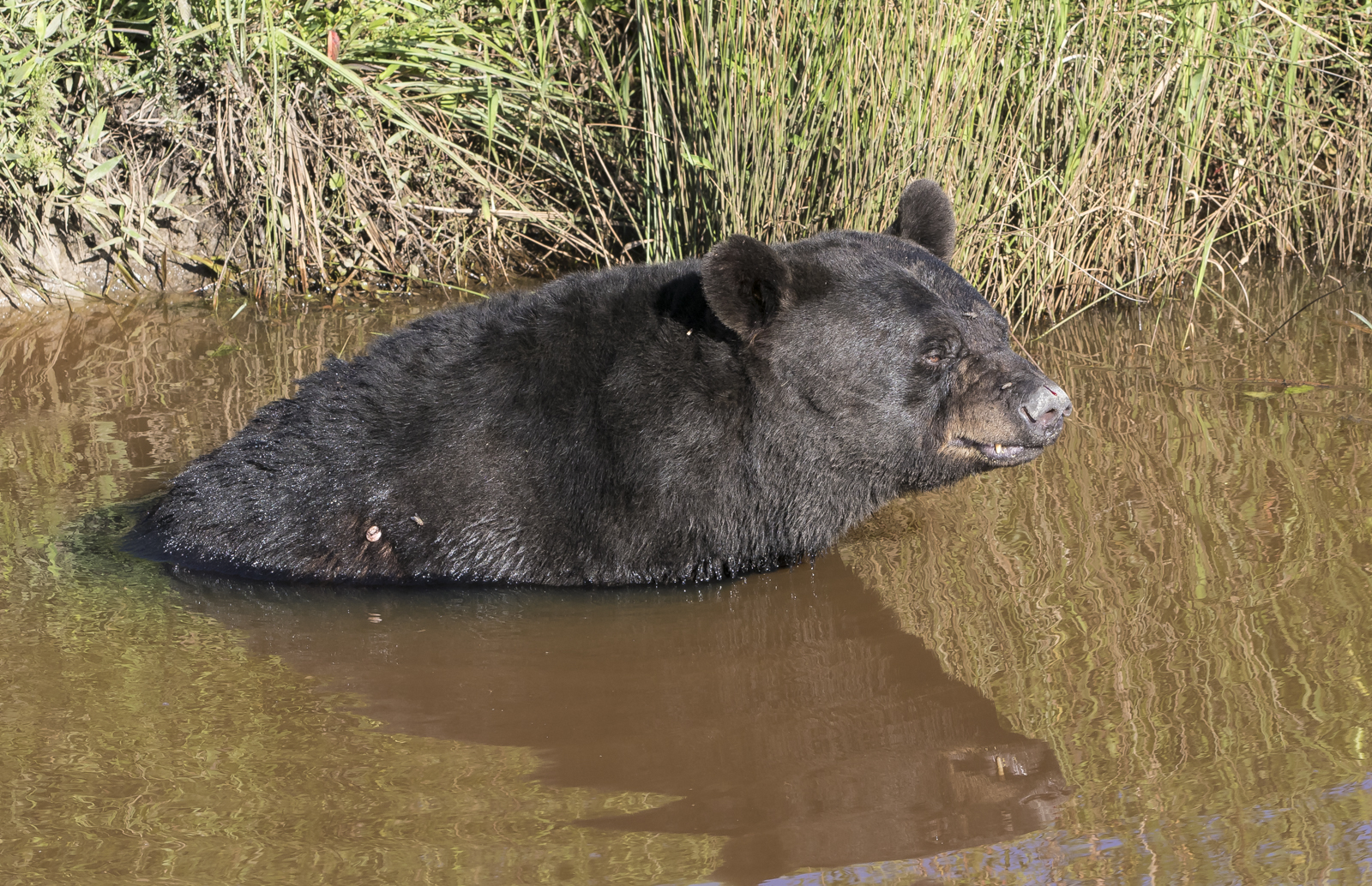 The afternoon temperatures reached into the low 90’s that day, so I am sure this water, in spite of its less than desirable look, was quite satisfying. A black bear’s normal body temperature isn’t far from our own, around 98 to 100 degrees Fahrenheit (it is less during hibernation). The thick black fur is a good insulator, but can present problems in the heat of summer. And, like dogs, bears lack sweat glands, so they must use other means to cool off – panting, lying in the shade, digging day beds to lie on the cool ground, or taking a nice plunge in the water. I have seen bears cooling off before in canals at Pocosin Lakes NWR, but have never been this close to one seemingly so relaxed in the cool water.