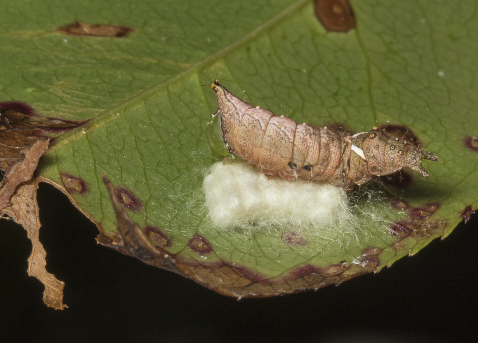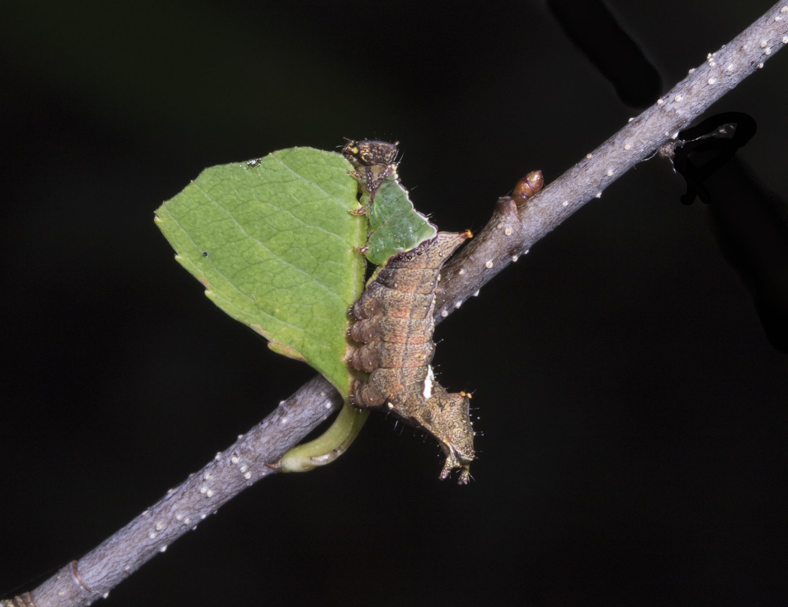 A close look at a later stage of the larva shows how well their shape, and even the smallest details of the patterns and lines on their body, help them to resemble dried portions of a leaf.