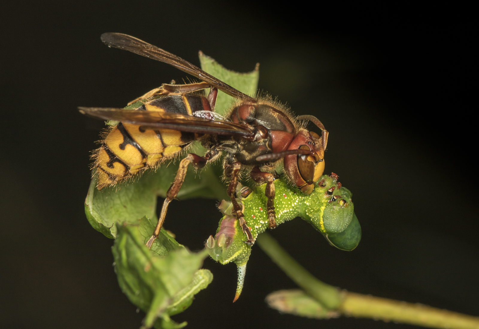 I walked over to take a look and saw a beautiful hummingbird clearwing larva, Hemaris thysbe, in the classic defensive pose of most sphinx moth caterpillars – front of body reared up, head tucked in, body aligned along the twig or mid-vein of a leaf. Suddenly, a huge European hornet, Vespa crabro, appeared and went straight for another caterpillar on the shrub, another hummingbird clearwing.