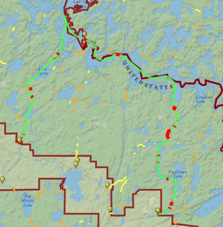 The thing that really struck me was the quiet and feeling of solitude of the Northwoods. Of course we did hear the melancholy calls of loons on several lakes, but that is a soft, singular sound that seems to drift across the lake like an early morning fog. It is as much a part of this wilderness as are the clear cold waters or the pointed tops of the conifers. Once the call passes, the world seems to fall silent again. At each landing, we usually heard what must be considered the signature chatter of the Northwoods, the chirping of a red squirrel. They quickly moved on to gathering cones and mushrooms and the forest became quiet again. There was also the occasional call of a pileated woodpecker, the croak of a raven, or the tweet of some small song bird, but not the usual background noise of birds and insects I am accustomed to back home. Perhaps that is what makes the call of the loon all the more significant. And after dark, if the wind was not rustling (or blowing the last two nights) through the trees, there was virtually no sound (except for the one night a beaver decided to slap its tail in protest of our campfire on its shoreline).