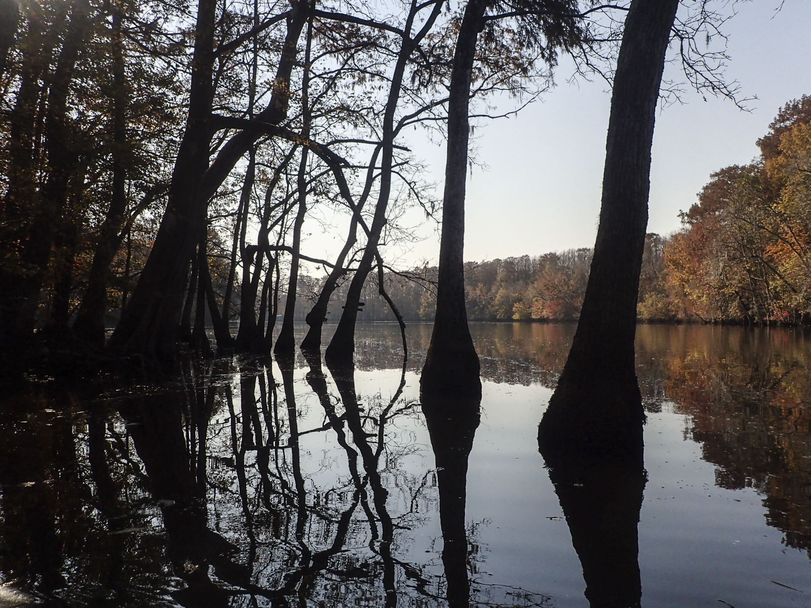 The paddle out was gorgeous, with fall colors scattered among the grays of the trunks and exposed bottomland muds. Along the way, we started seeing and hearing a number of the wildlife species that would be our companions for the next three days – anhingas, wood ducks, Eastern bluebirds, and the ubiquitous barred owls.