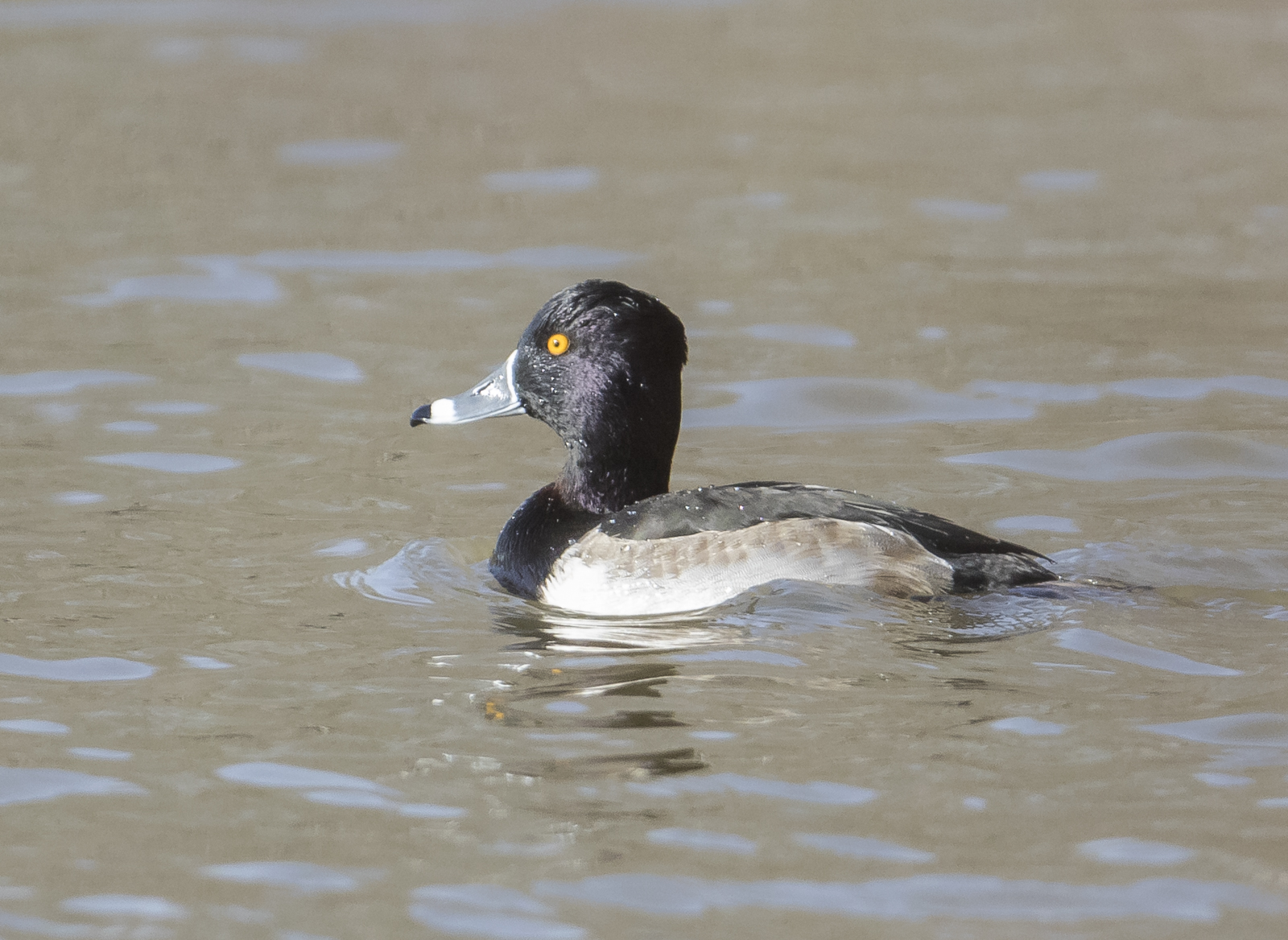I always enjoy seeing ring-necked ducks with their distinctive ringed bill and bold color pattern (that head can be quite purplish in the right light). Surely, the bearer of one of the least descriptive common names for a bird, the ring-necked duck is known to hunters by the much more reasonable common name of ringbill. There has even been a recent attempt, perhaps tongue in beak, to rename this beautiful duck to more accurately reflect its appearance (see http://www.audubon.org/news/its-time-rename-ring-necked-duck). The actual ring on the neck is a narrow chestnut brown band separating the dark head color from the dark breast feathers in the males only. Not a very useful field mark at all.
