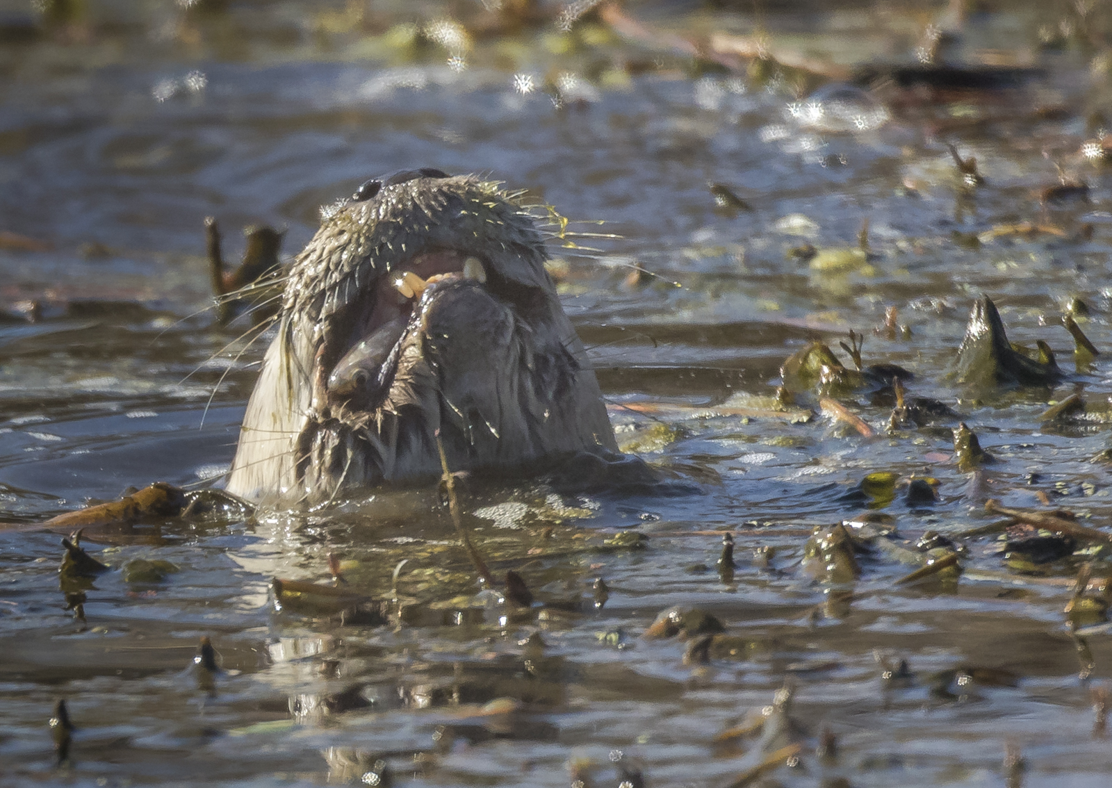 After the sunrise show at the platform, we headed over to “Bear Road” for a walk. Along the way, I spotted a pair of river otter in the roadside canal. They tend to raise up and snort a time or two when they first spot you, and then often disappear beneath the waters with a distinct kerplunk, only to reappear near or far, depending on how much they feel like tolerating your presence. These two were busy searching for fish in the thick mats of vegetation in the canals, and by the looks (and sounds) of things, they were quite successful. One guy caught several small fish while we watched, tossing his head back and crunching them in his jaws, the hapless fish seemingly gazing at us asking for help. But each fish disappeared rather quickly, with the otter then glancing our way before disappearing into the floating green mat.