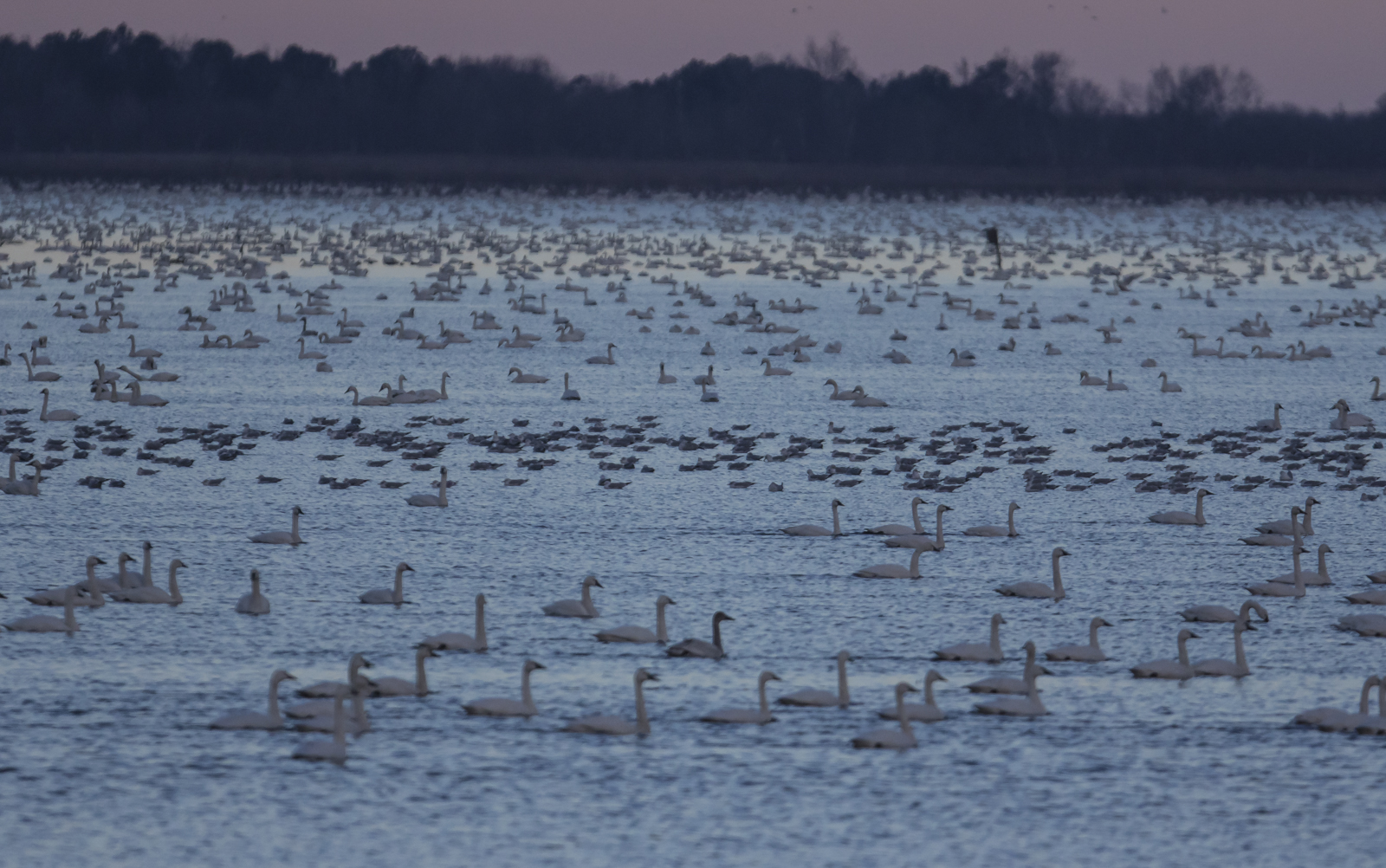 Amazing what a difference a day makes…Saturday morning was windy, causing the birds (numerous ducks, snow geese, and tundra swans) to seek shelter on the lee side of the west shore, which left the area in front of the observation platform a void, without any waterfowl readily visible. Sunday morning was calm, and our arrival at the platform before sunrise was greeted by thousands of birds just beyond the lake shore in front of us, seemingly filling almost every square foot of the lake’s surface. As the sun climbed higher, the dark shapes became a sea of brilliant white objects that filled the air with their sounds.