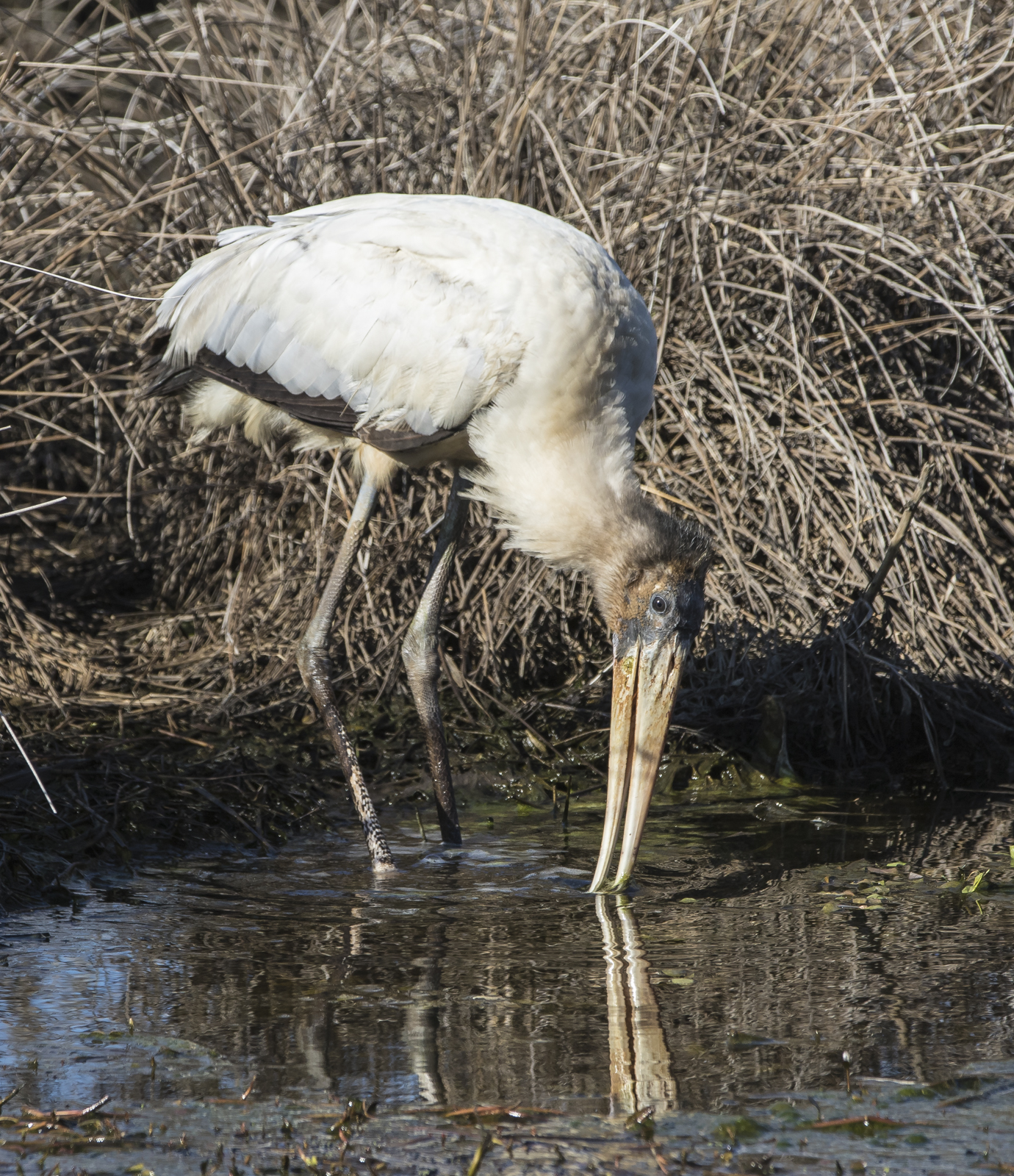 I have watched storks feeding in a group in Florida and South Carolina, but this one was doing something I had not seen – slowly walking, shuffling one foot, then the other, beak agape. The strategy is to startle a prey item by kicking the substrate with your feet, and if a fish, crayfish, or whatever hits the beak, it snaps shut.