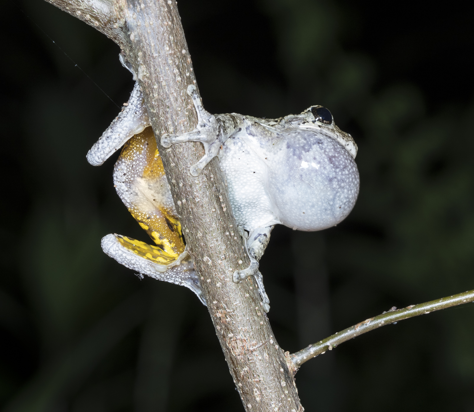 My apologies for once again using this corny phrase in a post about Cope’s Gray Treefrogs (see previous post about their life cycle). The recent downpours brought us over 4 inches of rain in two days last week. It was a boost for the plants and for our local frogs. A few nights ago I arrived home to the deafening trills of Cope’s Gray Treefrogs. I went out to investigate, and was amazed at how many were calling. It also reminded me of just how loud they can be when you get close to them.