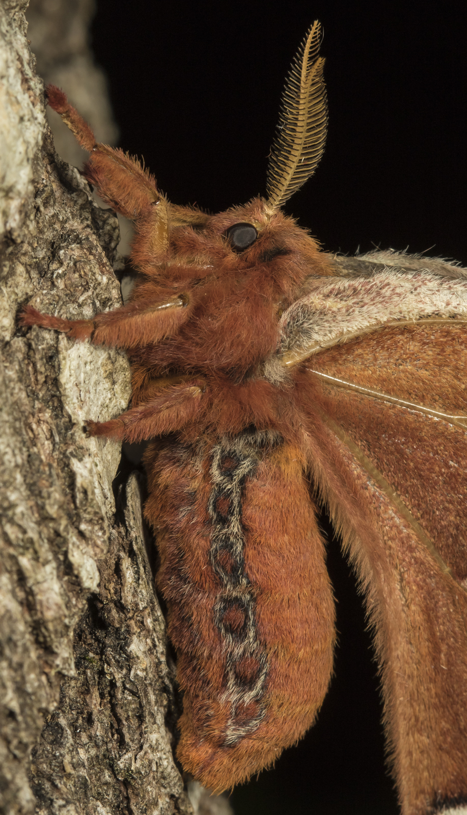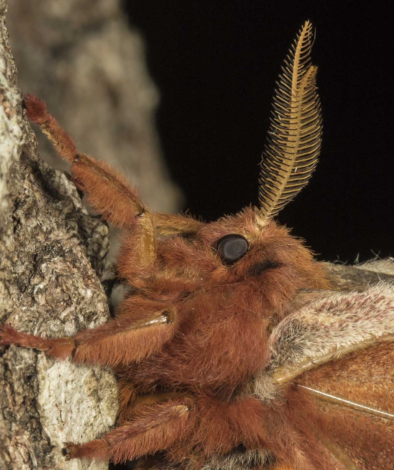 This species is identified by the brown and reddish-brown colors of the adults, and the presence of the angular, T-shaped spots on the wings. Late in the day, I placed the moth on a tree trunk and watched. She began to quiver her beautiful wings, the silkmoth version of revving your engines. This is how they get their body temperature up to a sufficient internal temperature for flight. It didn’t take long before this giant of the night sailed off into the trees. I’ll keep you posted on her eggs and larvae over the coming weeks.