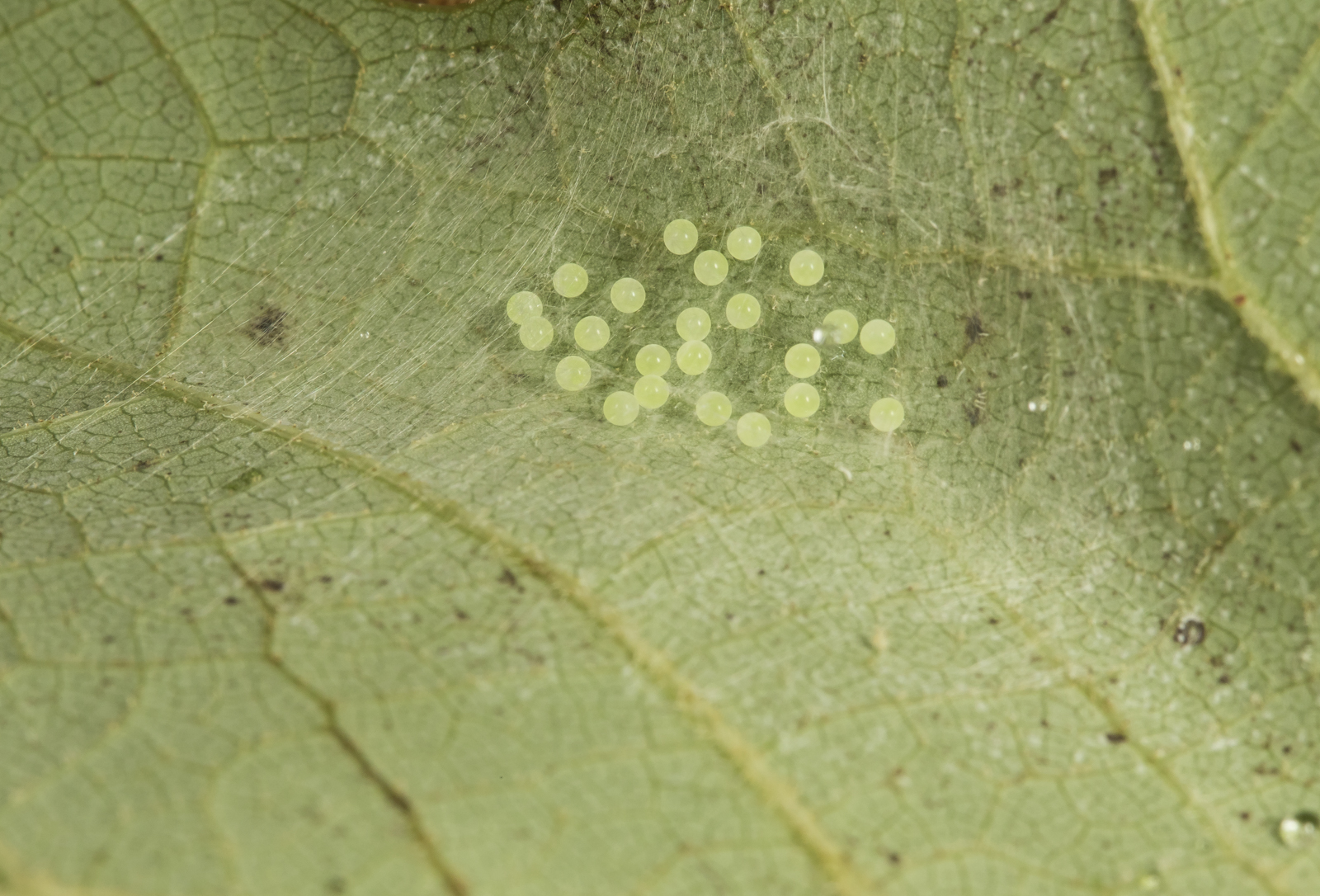 …a cluster of eggs in a loosely spun silken case on the underside of a tulip poplar leaf. They did not resemble the usual spider egg case, which tends to be enclosed in a globular silken egg sac. These were loosely dispersed beneath a sheet of silk as individual eggs. I checked online just to make sure and found some other images that confirmed these were indeed her eggs. Since I had already cut the branch, I decided to keep them and watch what happened.