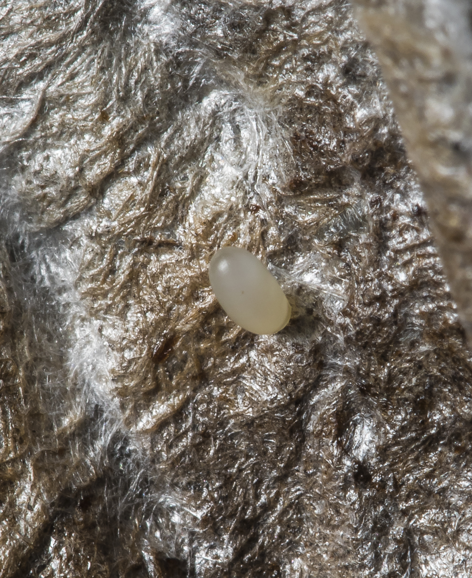 I gently tore open the nest I had removed and examined its contents. Eggs are small, somewhat oval in shape, and attached on the side walls of the cells.