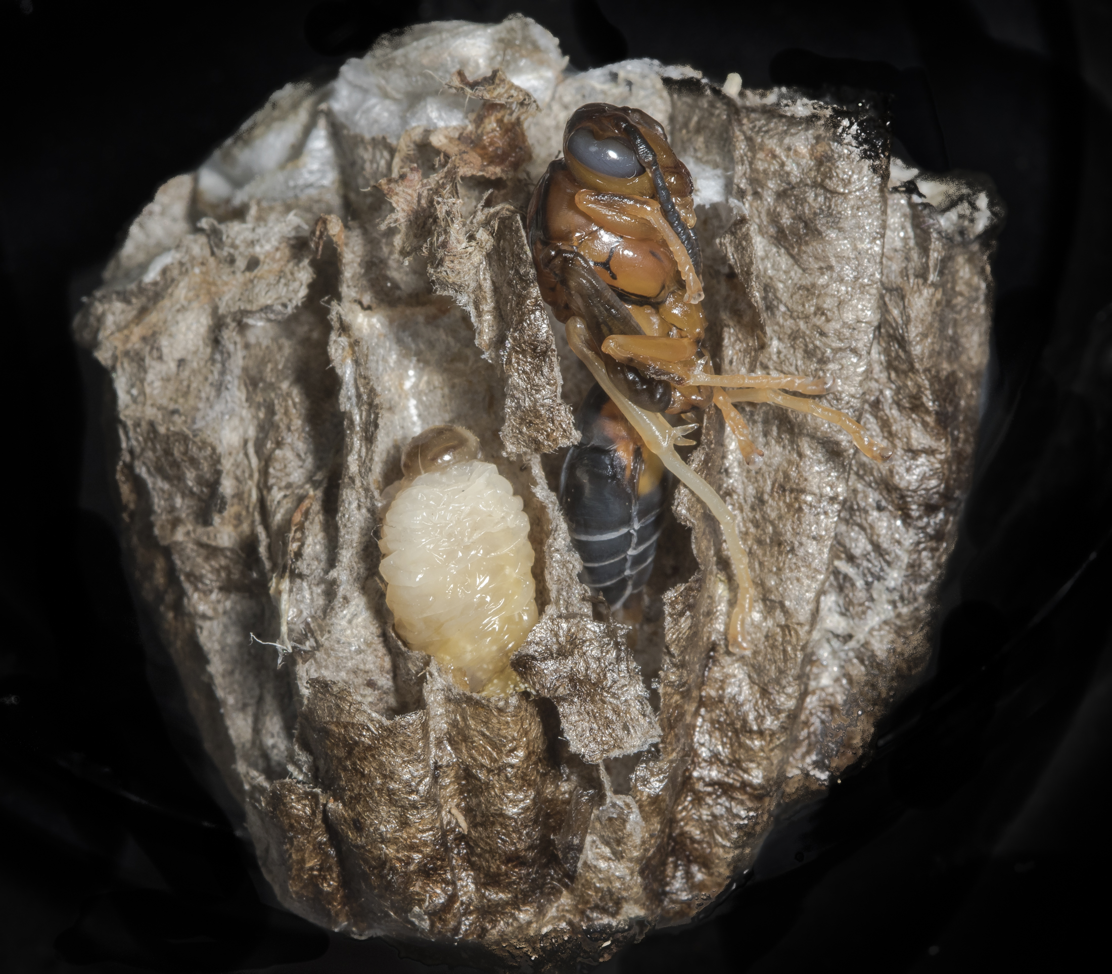 As I was teasing apart one of the cells, a pupa fell out (above). I am guessing this is still a female this time of year. Toward the end of summer, the queen (also called the foundress) lays a series of unfertilized eggs, which become males. Some of her fertilized eggs will receive additional care and nutrients and may become future queens that will mate and overwinter. At the start of cooler weather, the males, female workers, and original queen all die, leaving the new batch of potential queens to overwinter.