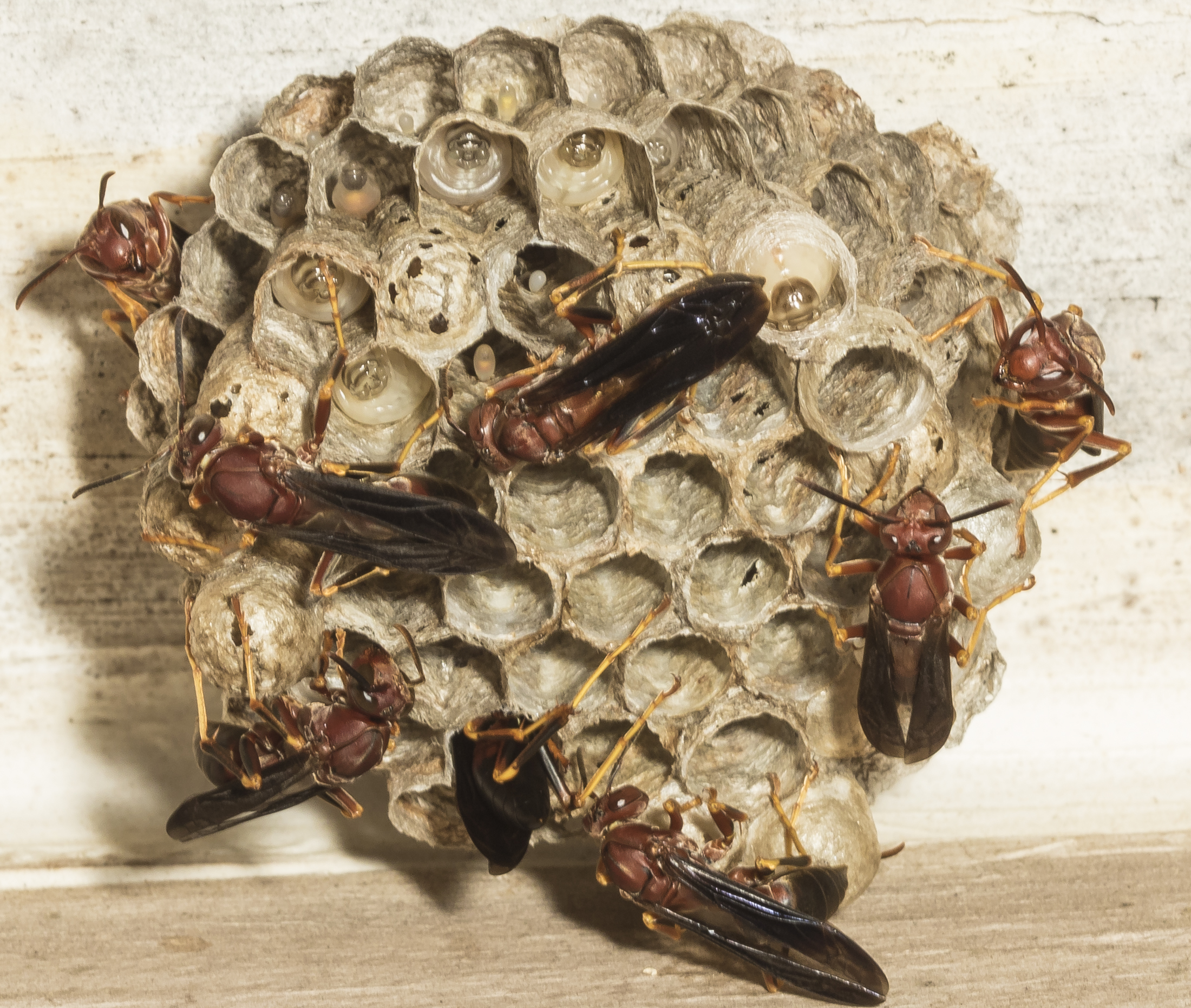 The first nests of spring are started by a mated female queen wasp that overwintered in some protected spot. She constructs that first nest by herself or with some subordinate females (usually sisters) that may have overwintered as well. Her first fertilized eggs are all female and are destined to become workers. Once they emerge, they take over the duties of caring and feeding new larvae. Workers forage for caterpillars and other soft-bodied insects that they chew up and feed to the larvae. Adult paper wasps feed on rotting fruit and nectar, so wasps are important pollinators and biological controls of plant-eating insects.. The photo above shows a worker female tending some of the brood cells. Eggs, in various stages of development, can be seen in some cells. The fat, white larvae with grayish heads, can be seen in others. Cells with paper coverings contain pupae.