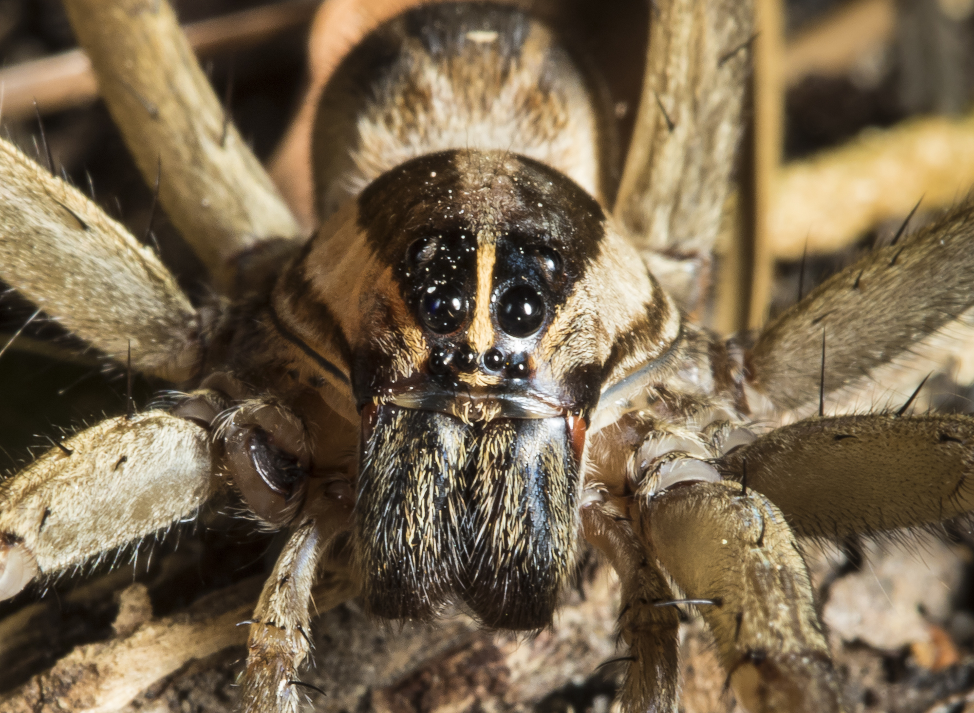 As we walked along the forest edge, someone spotted a huge wolf spider. I bent over for a closer look and a quick picture of its enormous (and numerous) eyes. I’m not sure how the common and scientific names came about (rabidus is Latin for wild, crazy, raging), but maybe some early arachnologist laid down and looked into the face of one of these huge spiders and felt a slight twinge just as I did.