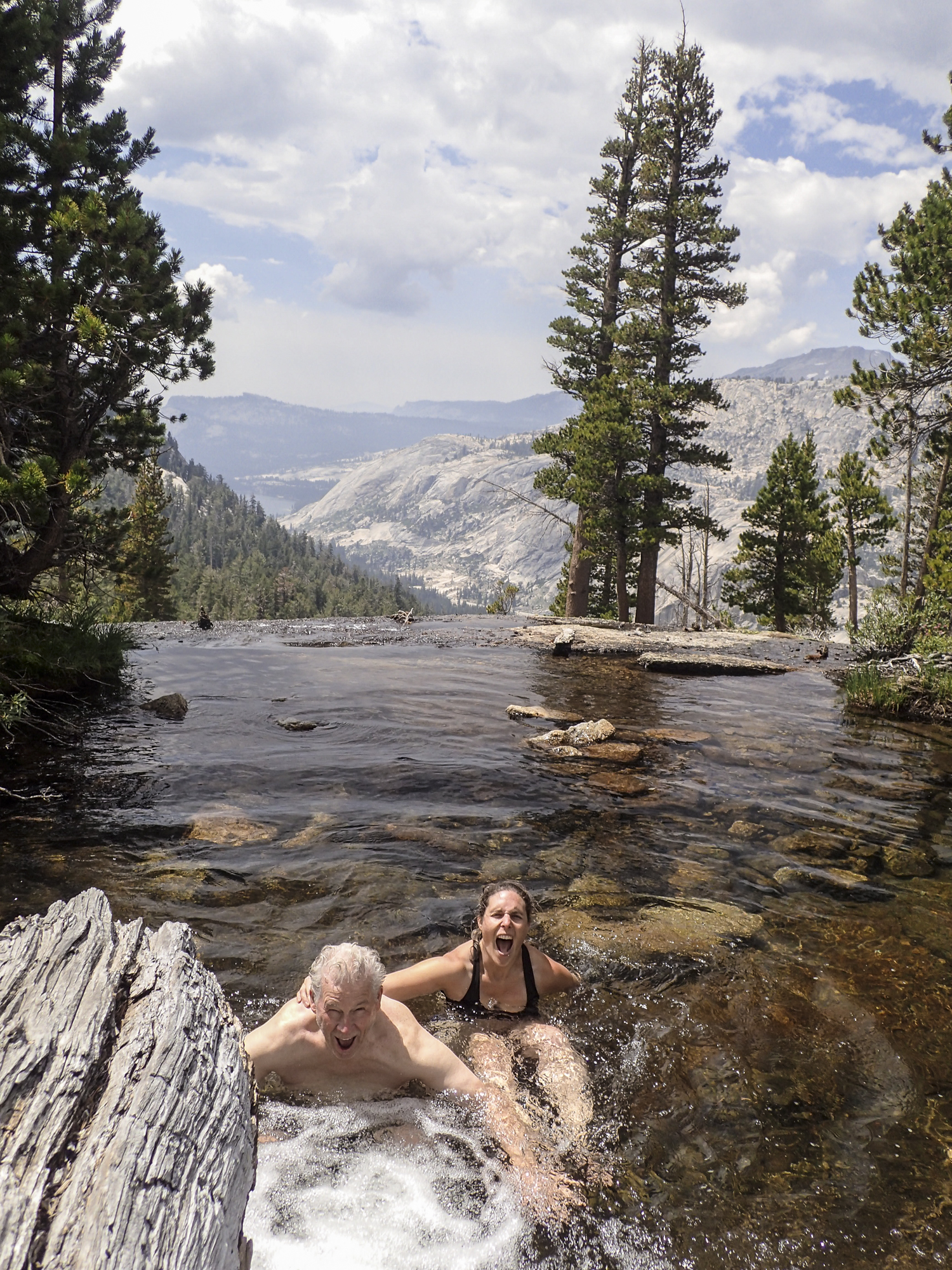 Melissa never misses a chance to take a dip in mountain water, no matter how cold, so, once again I was convinced to cool off in a gorgeous pool at the far end of the lake. This particular pool probably had the best view of any spot we have ever dipped our toes in. Not far beyond our swimming hole (well, really just a splashing hole due to temperatures and water depth) the lake water left its calm existence and plunged down a waterfall, exposing a view off to the mountains and valleys beyond. Megan managed snap the shutter at just the right moment to capture that quintessential expression we often have when first squatting down in a mountain stream.