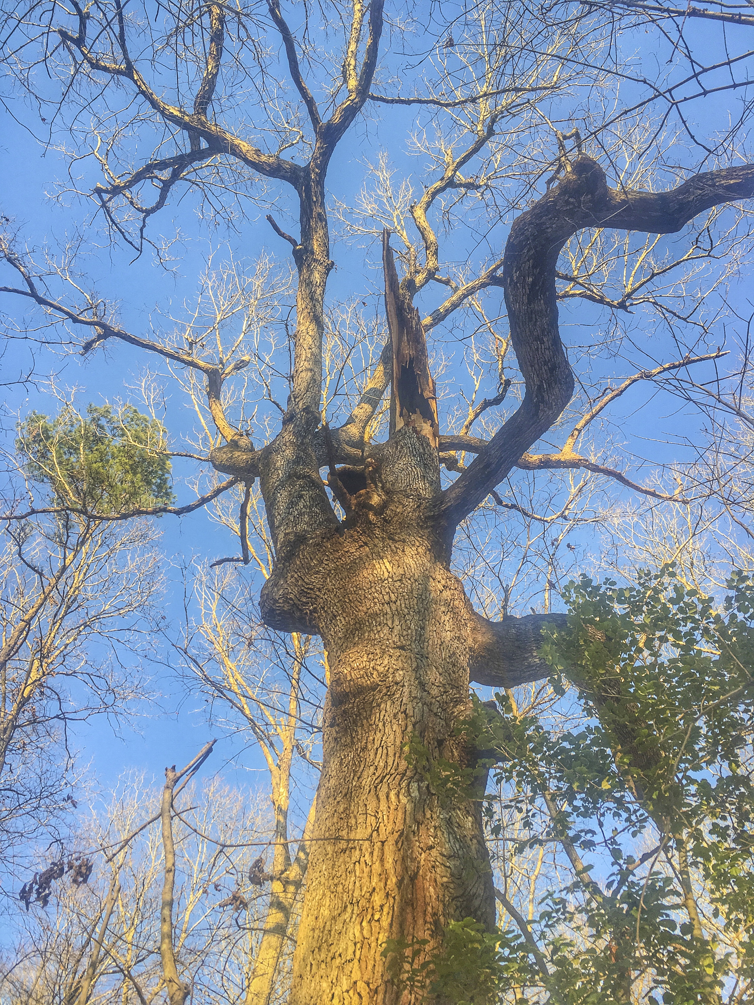 The far property boundary is marked by a nearby giant – a huge white oak that is the largest tree on our land. I like to think it is 250+ years old based on its huge size compared to other trees I had to cut after storm damage. One of those had 126 growth rings, and it was nowhere near the diameter of this behemoth. A huge limb broke out this winter, providing a sheltered hollow that I hope one day will be taken up by one of the resident owls. I can’t help but think that I am not the only creature in these woods fascinated by this giant.