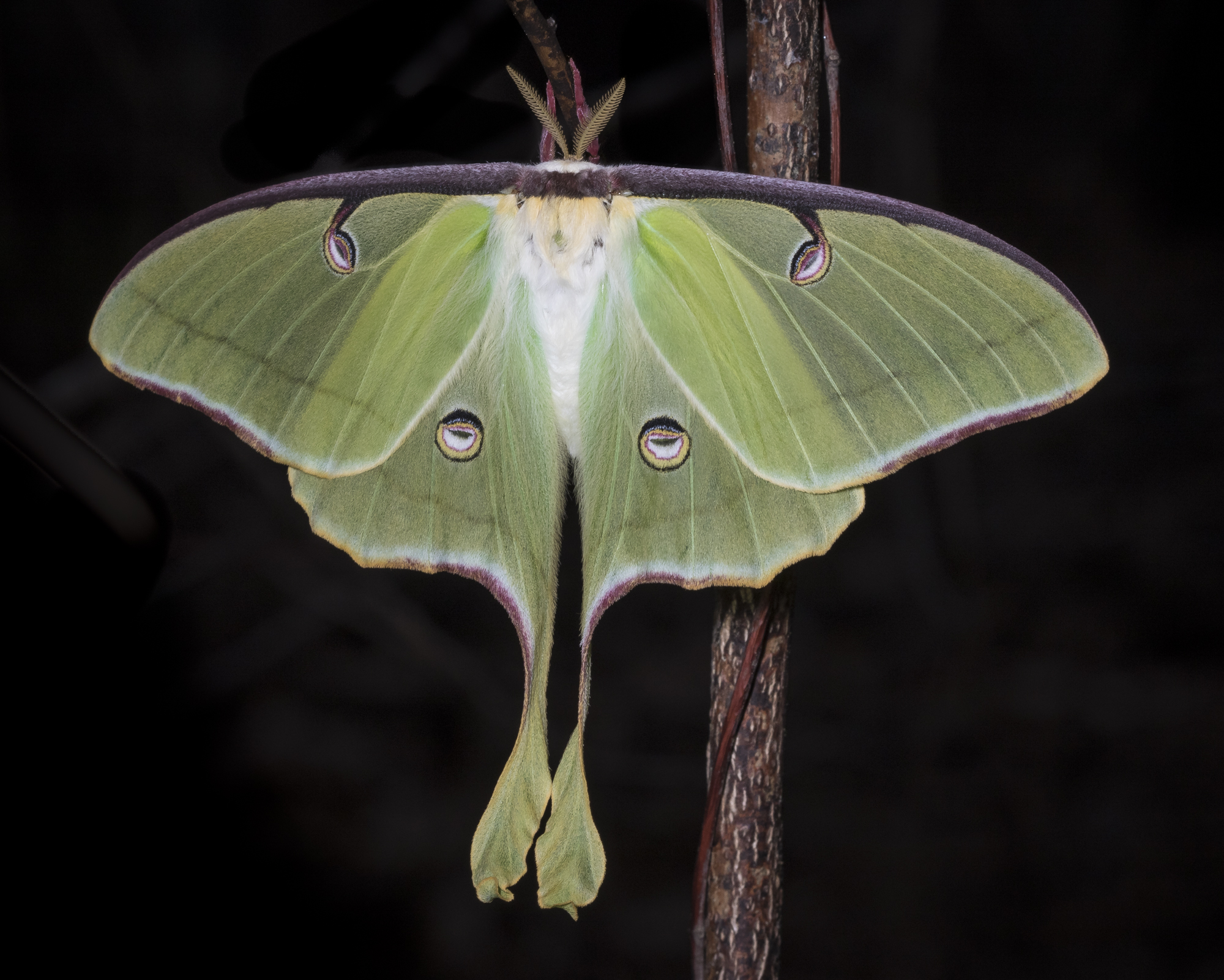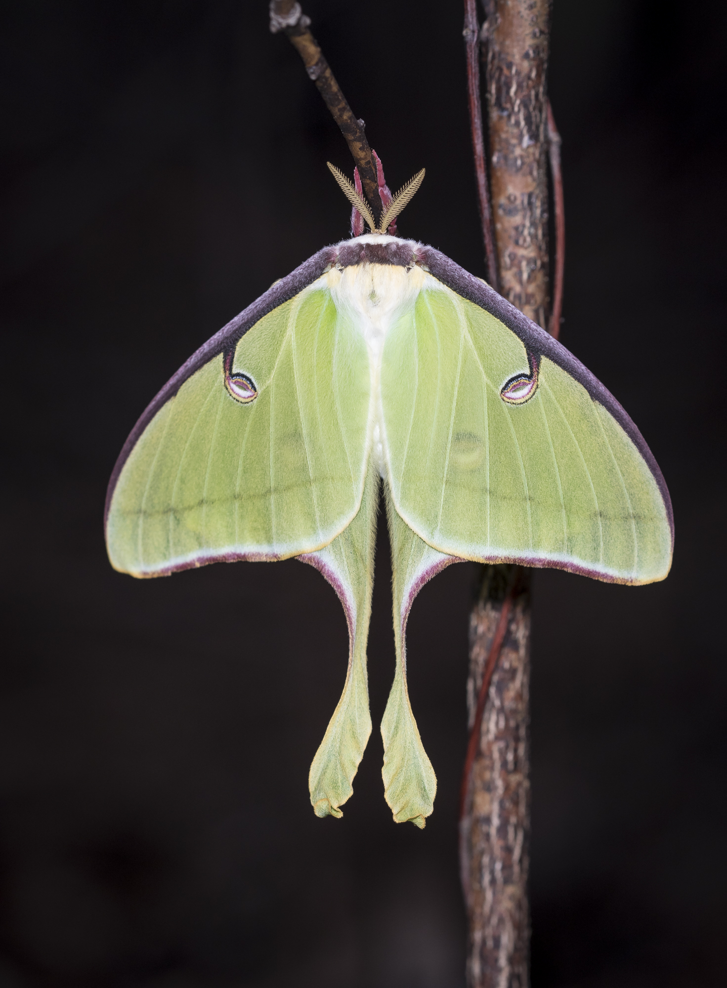 I ran to get our cameras and we spent the next 30 minutes observing and photographing this beautiful creature. The long tails are a gorgeous and diagnostic feature of this species. And, according to recent research, they serve a potentially life-saving function for these giant silk moths. When flying, the fluttering tails appear to create an acoustic signal that causes hungry bats to zero in on the moths’ tails, missing the vital body parts, and allowing many moths to escape.
