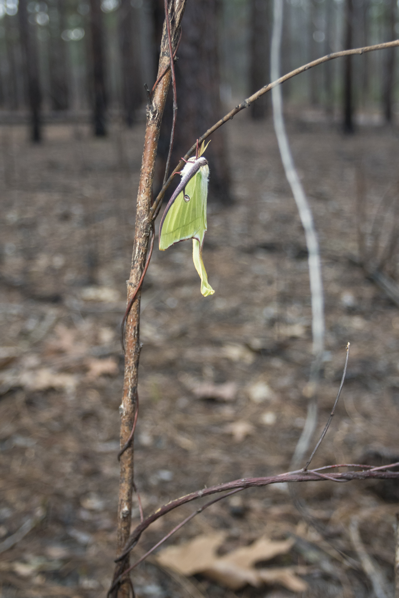 When you only live a week or so as an adult, every miss from a predator seems to have added importance for your reproductive success. Female luna moths scatter their couple of hundred eggs on host plants such as sweetgum (the dominant in our area), persimmon, and hickories over the few nights of their active flight. There are generally at least two generations per year in our area with the Fall generation overwintering as a cocoon. The Fall caterpillars wrap themselves in leaves and silk and are usually hidden in the leaf litter until they emerge in spring. And that is what piqued our curiosity with this particular moth. How had it survived the ground fire just a couple of months ago?