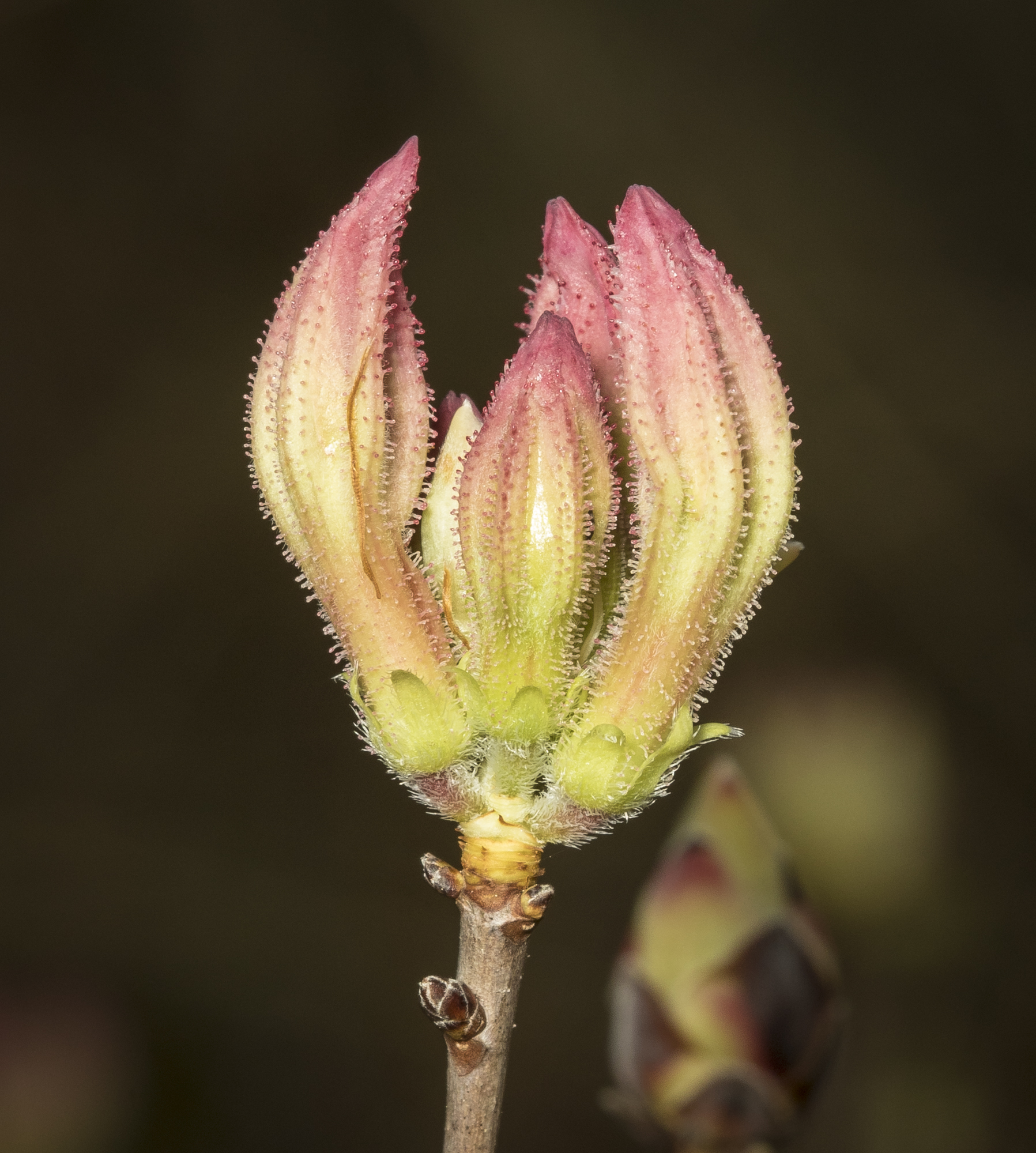 The upper lip of the orchid is hinged at the base. When an insect lands on it, the lip drops, flopping the insect onto the reproductive parts of the flower (called a column) hopefully leading to pollination. In the photo above, the twig pushing down on the lip shows what happens when an insect, such as a bumblebee, lands on the yellow hairs – it is dropped down onto the column.