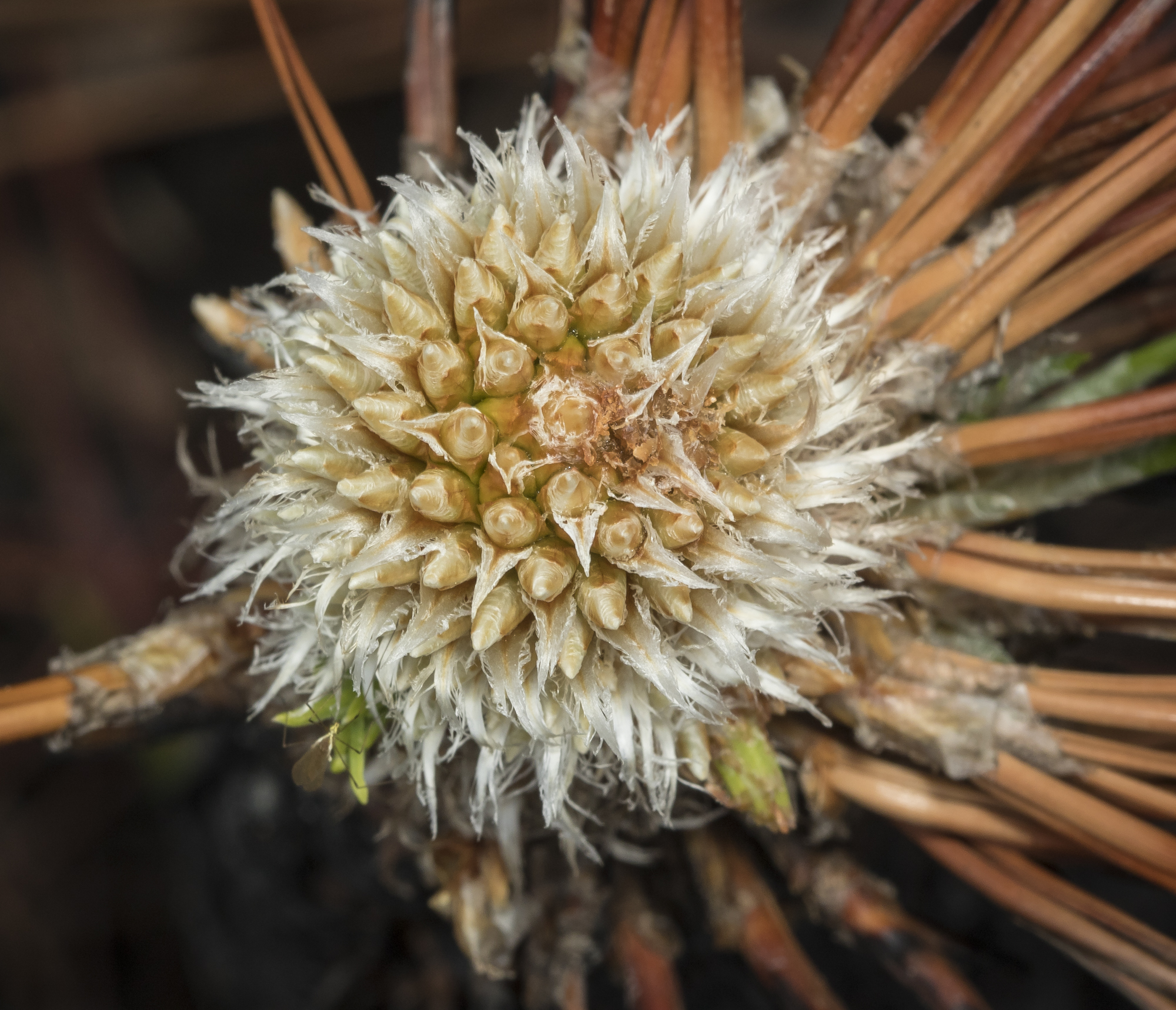 The pine savannas are known for their unusual plants, including a host of native orchids. Early in the season, the grass pink orchids, Calopogon sp., dominate. The genus name is Greek for “beautiful beard”, referring to the cluster of yellowish hairs on the upper lip of the flower. This flower produces no nectar, but the bushy hairs resemble the pollen-bearing anthers of other flowers, thus fooling insects to land for a snack.