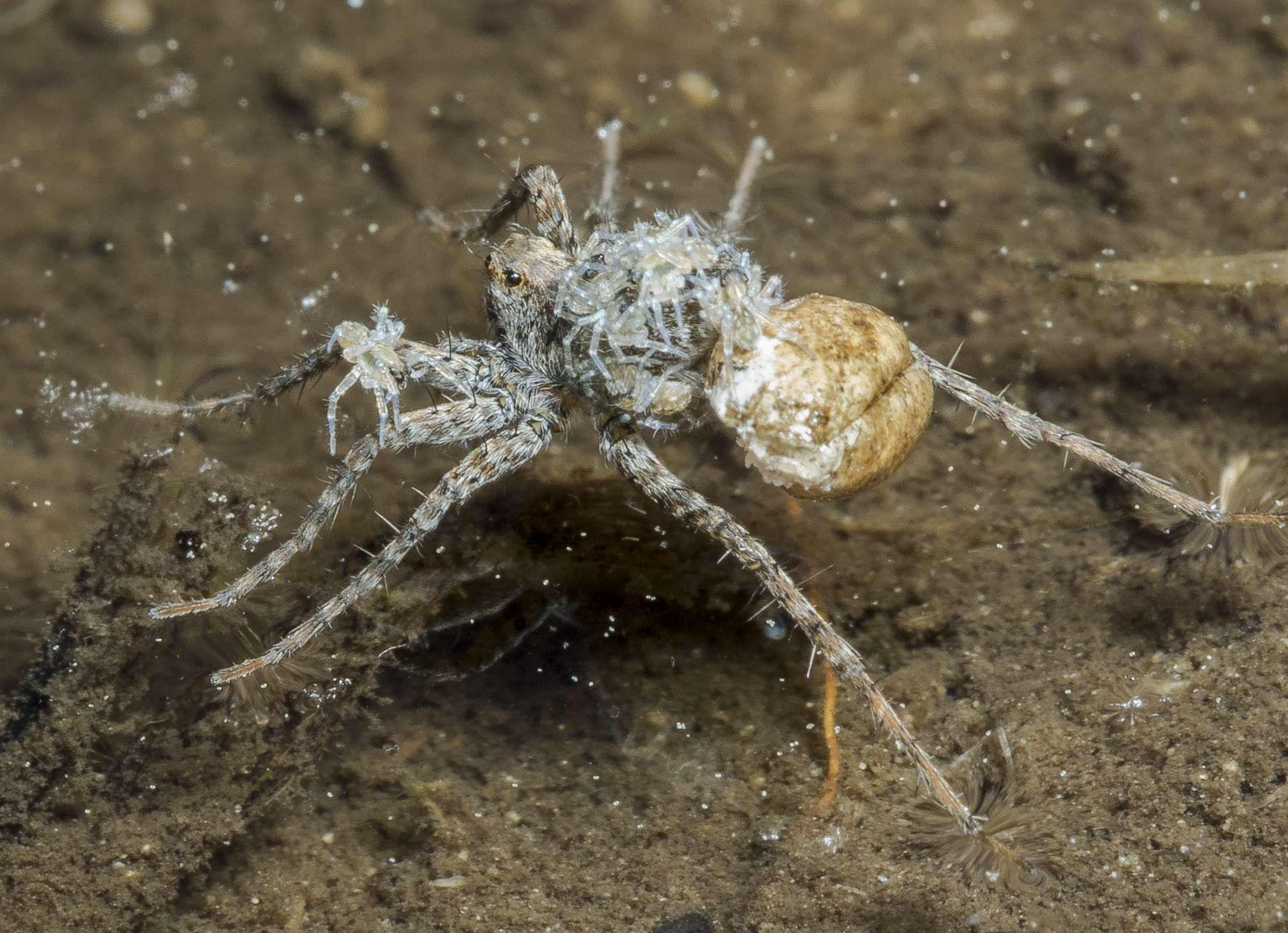 This mother wolf spider is carrying her egg sac on the tip of her abdomen while the spiderlings hatch and crawl onto her back. They will cling to her for a few days until their first molt.