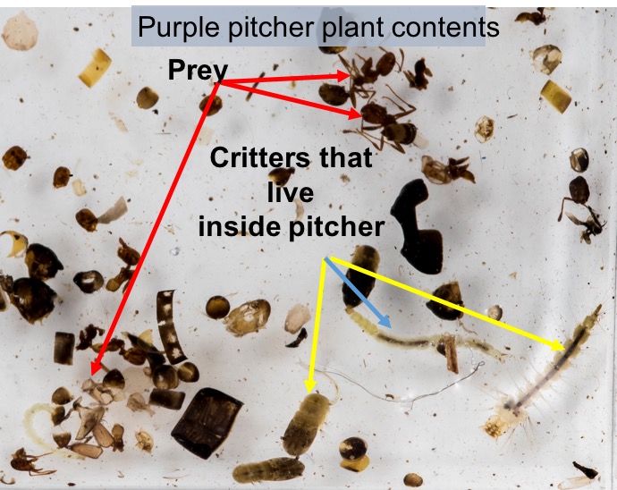 Prey are believed to drown in the open pitcher of purple pitcher plants, S. purpurea. Microorganisms living inside the pitchers contribute to decomposition and nutrient uptake by the plant. If you look inside one of these pitchers, you may see things swimming in what you would think would be a deadly soup. We pulled a turkey baster full of liquid out of one pitcher and found both prey remains and living organisms that use it as a home.