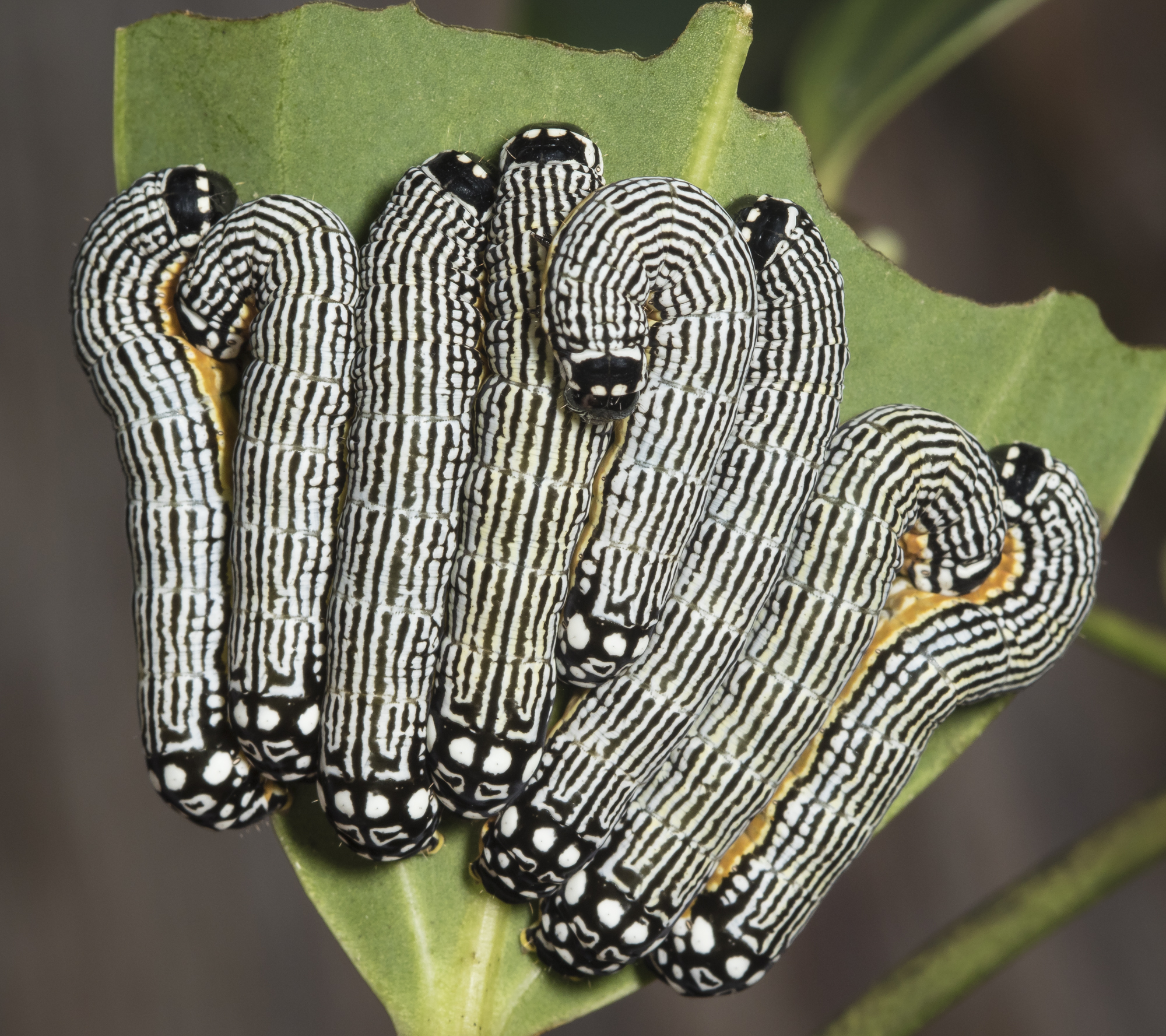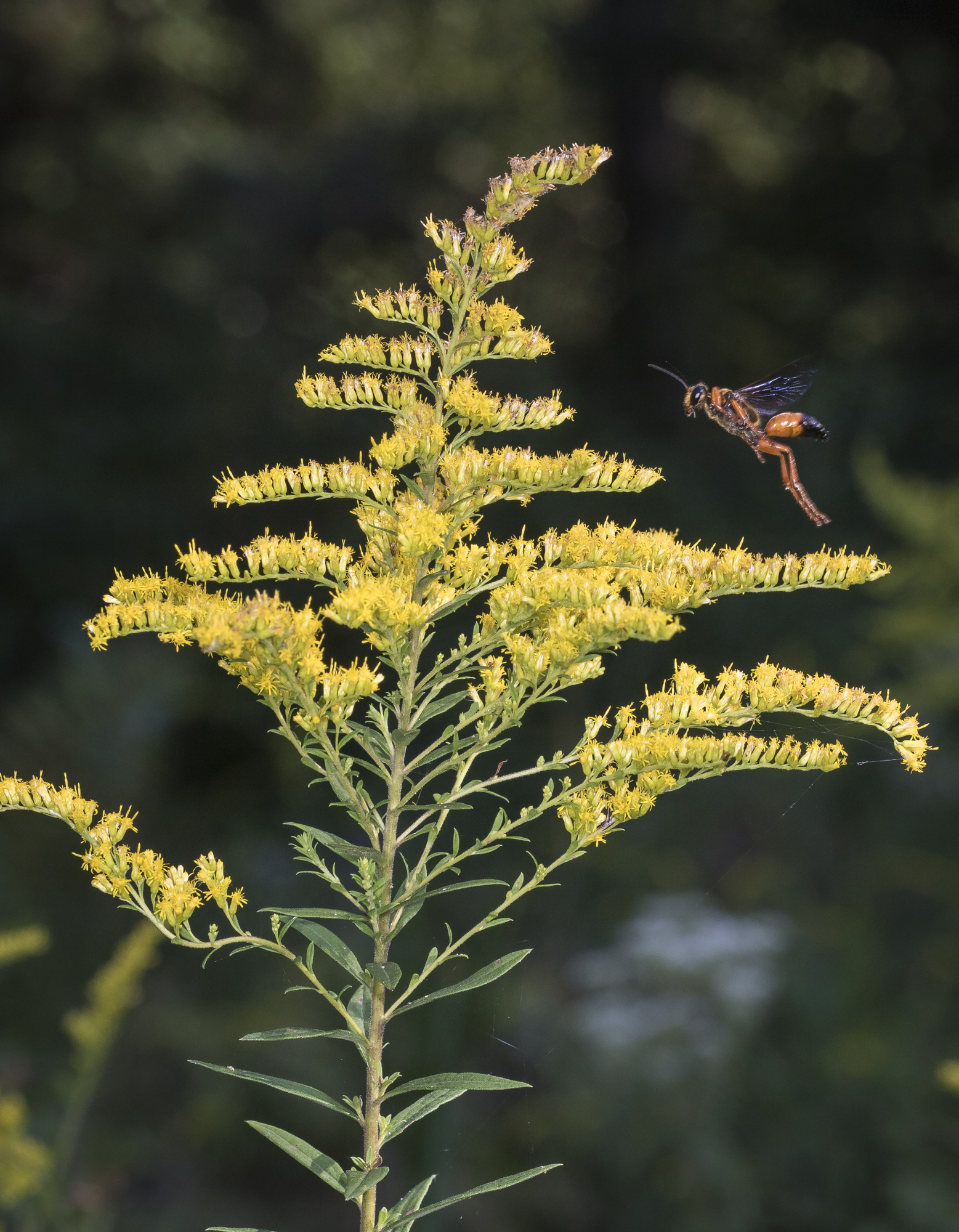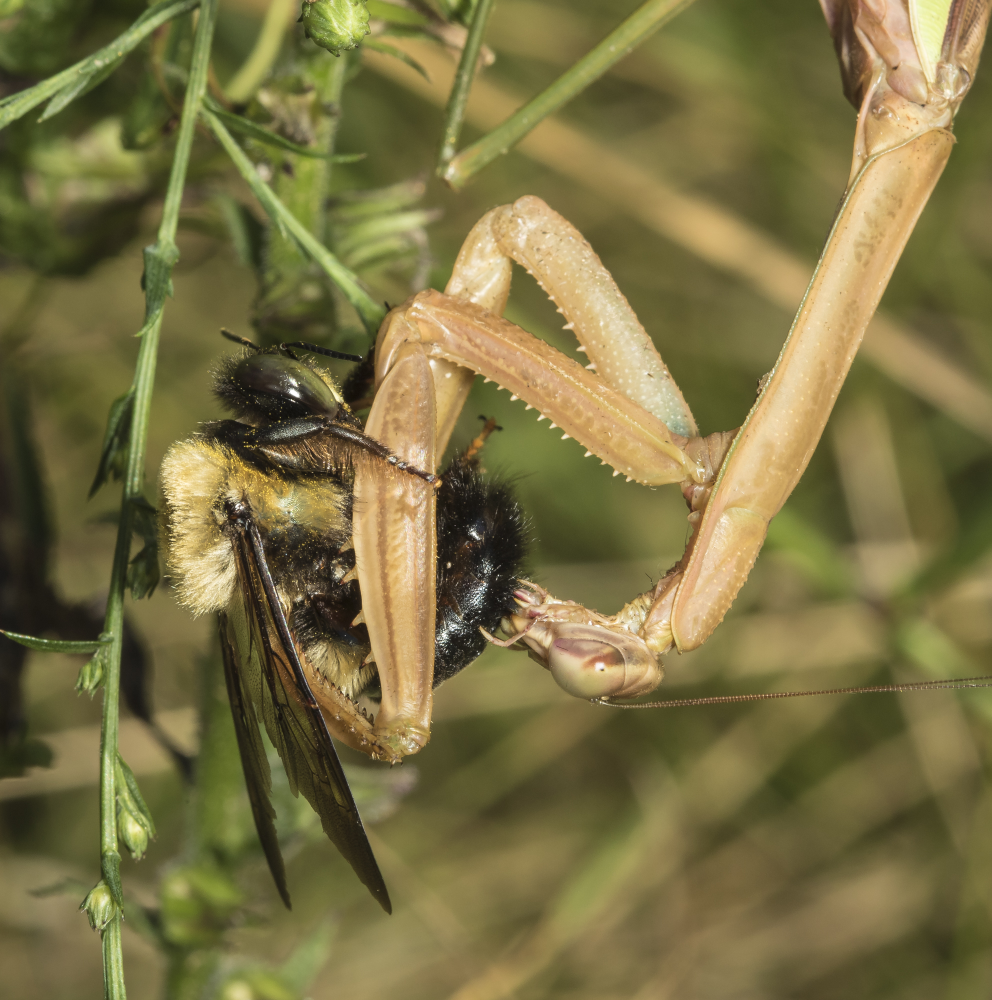 This larva has fallen victim to a wasp parasitoid. The white silky blob beneath the caterpillar are the wasp cocoons. One study estimated that 10 to 25% of all last instar caterpillars are parasitized by wasp or fly parasitoids.The day after my caterpillar program we discovered this group of turbulent phosphila moth larvae feeding on their host plant, greenbrier. It can be hard to tell which end is which on this gregarious feeder.Certainly one of the stranger-looking groups of moths, the plume moths, resemble tiny gliders.The week ended rather poorly for this male carpenter bee that was prey for this Chinese mantis.Fall is just around the corner when the goldenrods (Solidgo sp.) are in bloom.