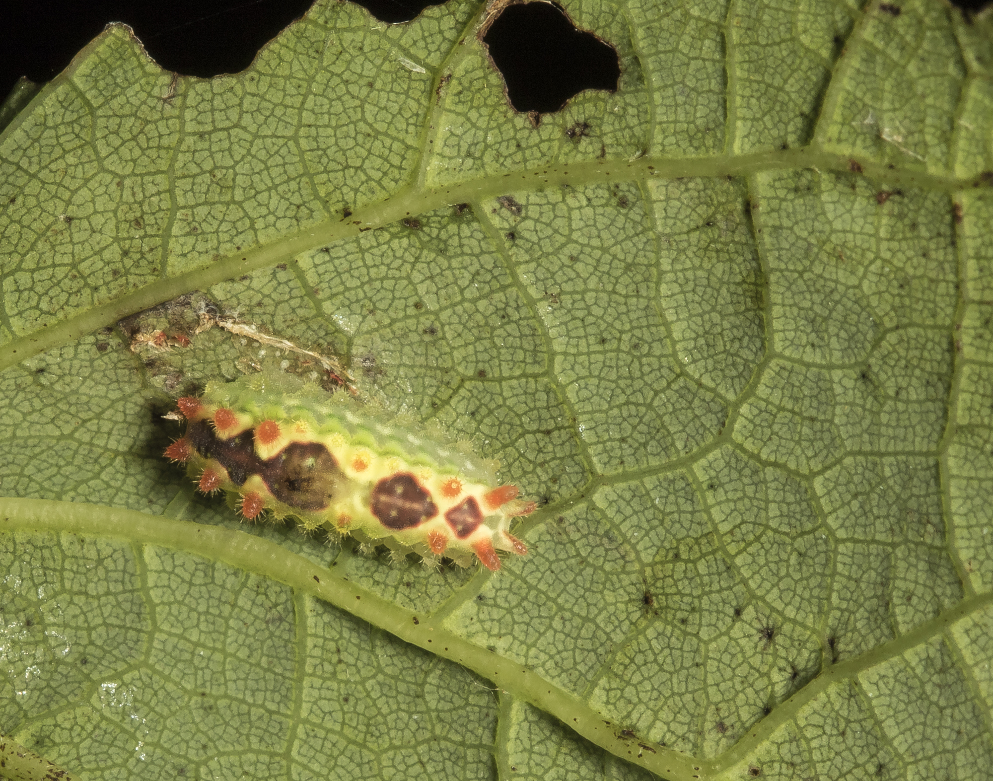 One of the horticulture staff spotted this female marbled salamander (females have gray markings, males have white ones) among the soil around some plants in the Display Gardens. She will be laying eggs soon in a wetland depression and will guard them until rains fill the pool.Seed pods of Hearts-a-bustin, Euonymus americanus, one of my favorite native shrubs of autumn.A purple-crested slug moth caterpillar (Adoneta spinuloides) that has recently molted.