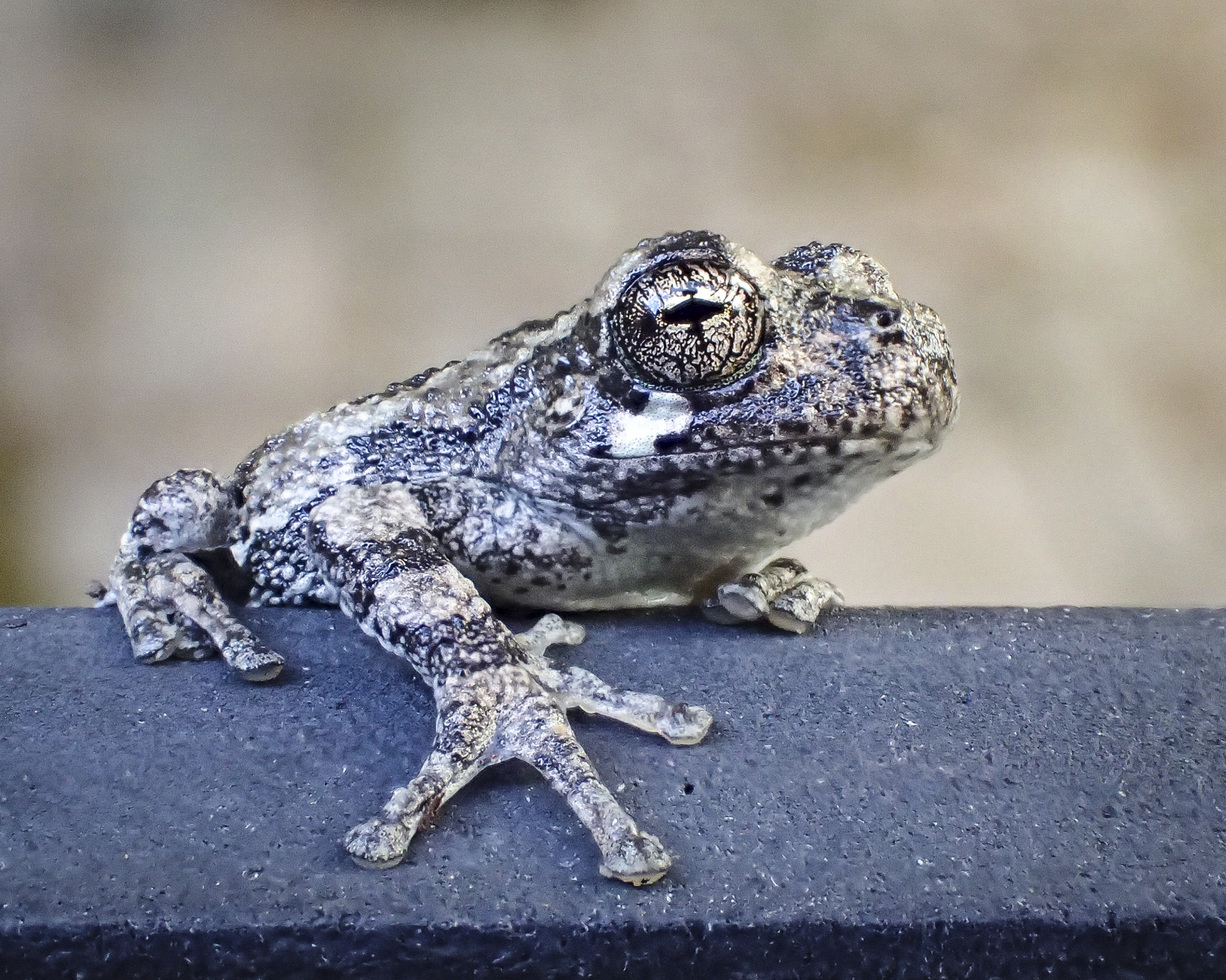 A co-worker alerted me to this chillin’ Green Treefrog, who stayed calm throughout its brief photo shoot, in spite of me manipulating its leaf bed for a better angle.