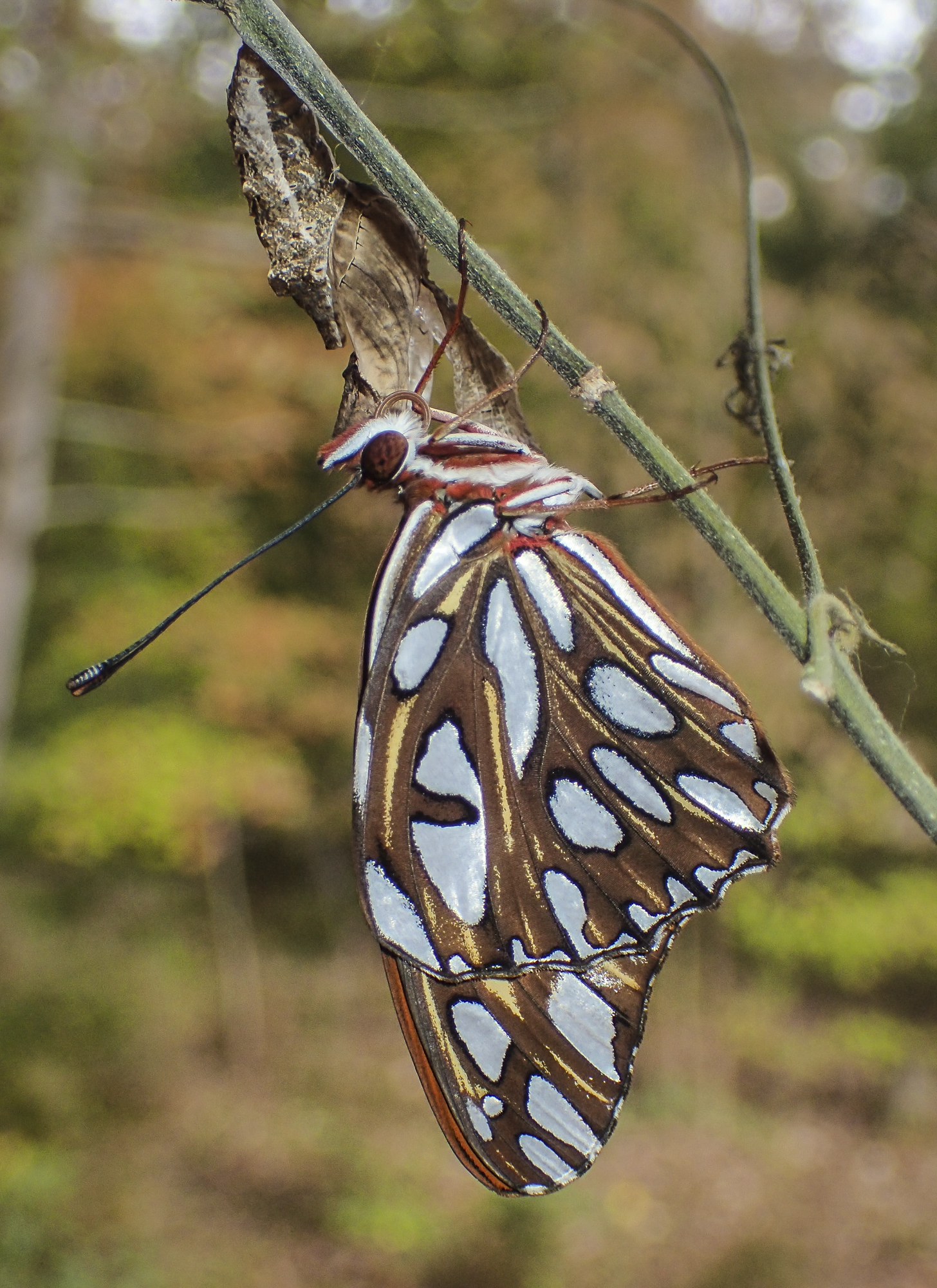 I am not sure whether Gulf Fritillaries overwinter as a chrysalis this far inland as they are a partial migratory species from further south and along our southeastern Coastal Plain. So, I was curious what this chrysalis would do. I watched it for a several days and was surprised how it changed position by twisting and turning, and then holding that new position for hours. It finally emerged on Friday.