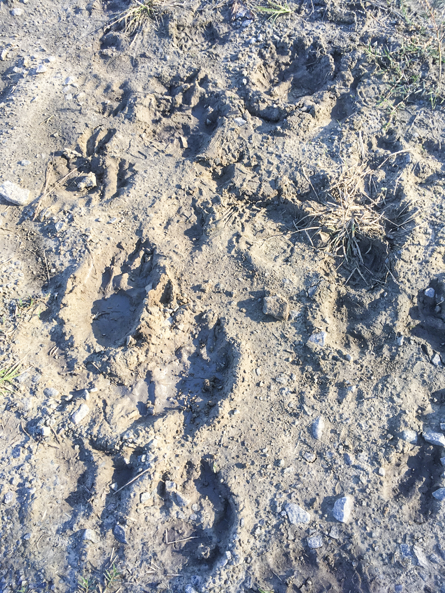 On to “Bear Road” where we saw several people parked at the gate and sitting along the road waiting for an appearance by one of the area’s many resident bruins. The tracks in the hardened mud tell the story…frequent comings and goings from the dense woods to the local feed store, the cornfield across the road and canal.