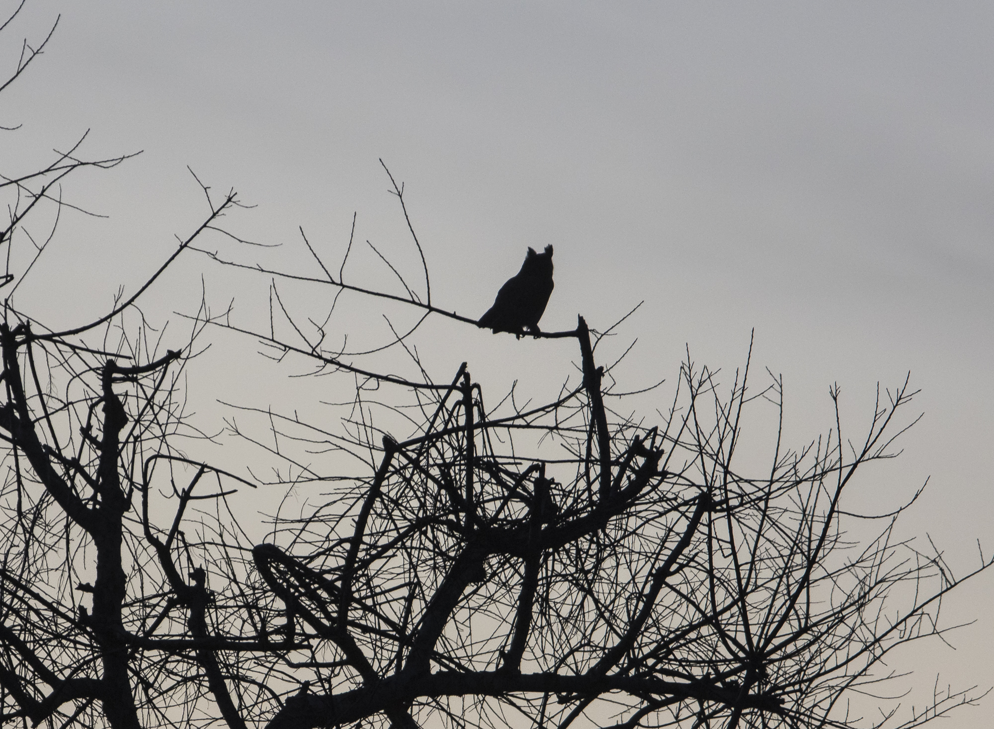 The walk back to our cars was classic Pungo – we could hear swans calling on the lake, a few scattered flocks flying in from the north, a bald eagle flying out over the fields, and bears starting to move from the protective cover of the forest edges to their evening meal in the corn. Closer to the cars, we heard, and then saw, a great horned owl, silhouetted against the sky. A perfect ending to a great walk. One thing of interest about the owl photo – the tree top has a lot of broken branches in it. This is a wild cherry tree, and, though it looks like storm damage, it is actually where black bears have broken the branches to get to the cherry fruit. Every cherry tree along this road edge has broken branches like this where foraging bears have climbed the tree and pulled down the smaller twig tips to gorge on the ripe cherries.