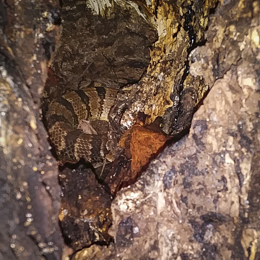Not far from from the bear tree, we eased up to another tree where I had a special encounter three years ago. I was telling one of our guests about that incident as I slowly approached another tree with a hollow base, when, suddenly, a huge canebrake rattlesnake flung itself toward the tree and disappeared into the hollow. I had been scrutinizing this particular hollow as this was the same tree where I had encountered a rattlesnake on a day in January, 2016. But this time, the snake was several feet outside the hole, and, I must admit, it startled me with its quick retreat back into the safety of the tree. I had left my phone back in the car, so Scott was kind enough to get a photo where you could at least see part of the snake inside the hollow. This is pretty remarkable if this is the same snake from 3 years ago (and I think there is a good chance it is, since research has shown snakes are often quite faithful to their overwintering sites). This place never ceases to amaze me.