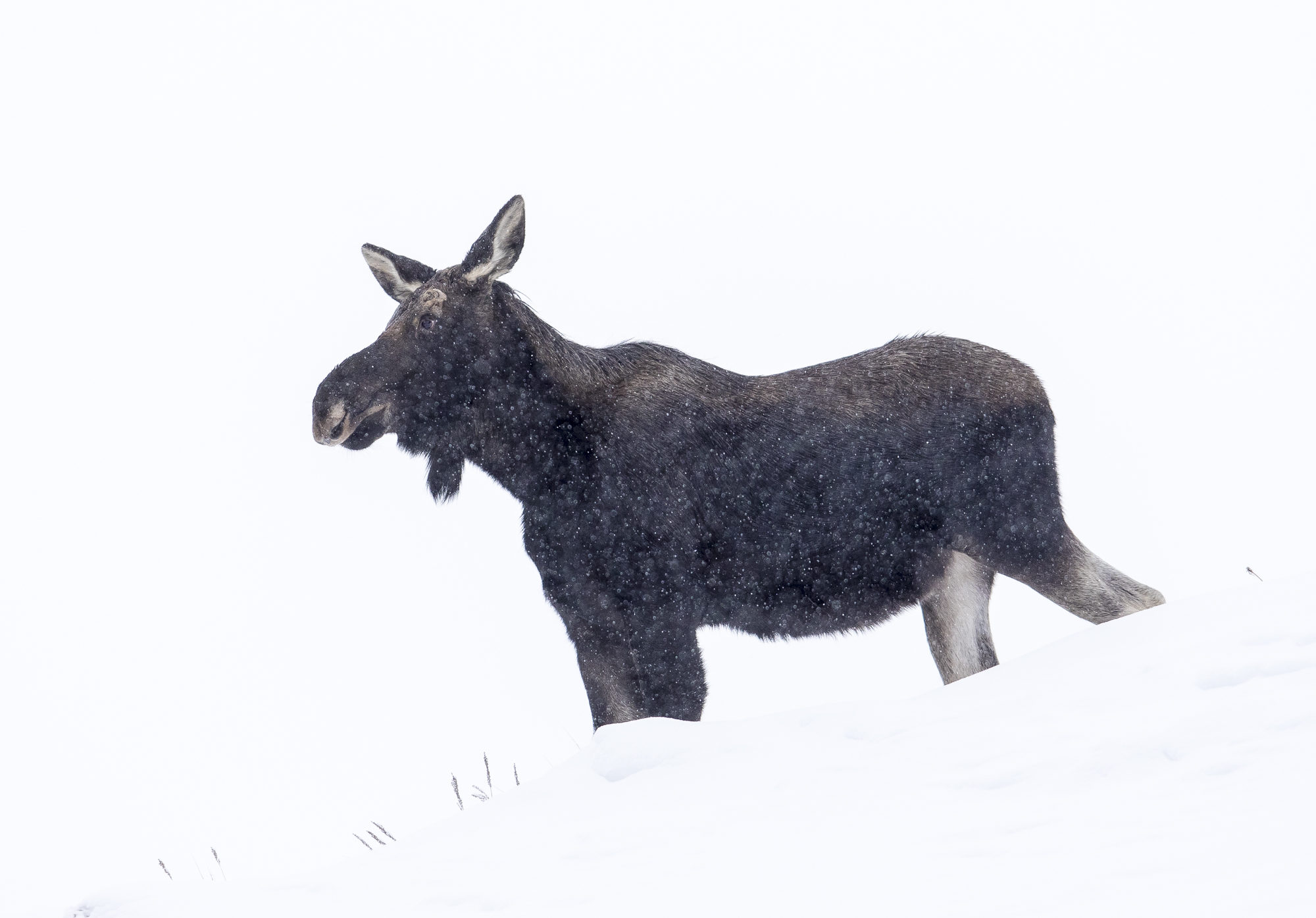 The moose quickly came down the hill, moving gracefully through the drifted snow. Large hooves, long legs, and a special gait (due to the ability to swing out their legs over the snow) allow moose to move through deep snow more efficiently than most ungulates (hoofed mammals). This one made its way down the hill, across the road, and into the forest in a matter of seconds.