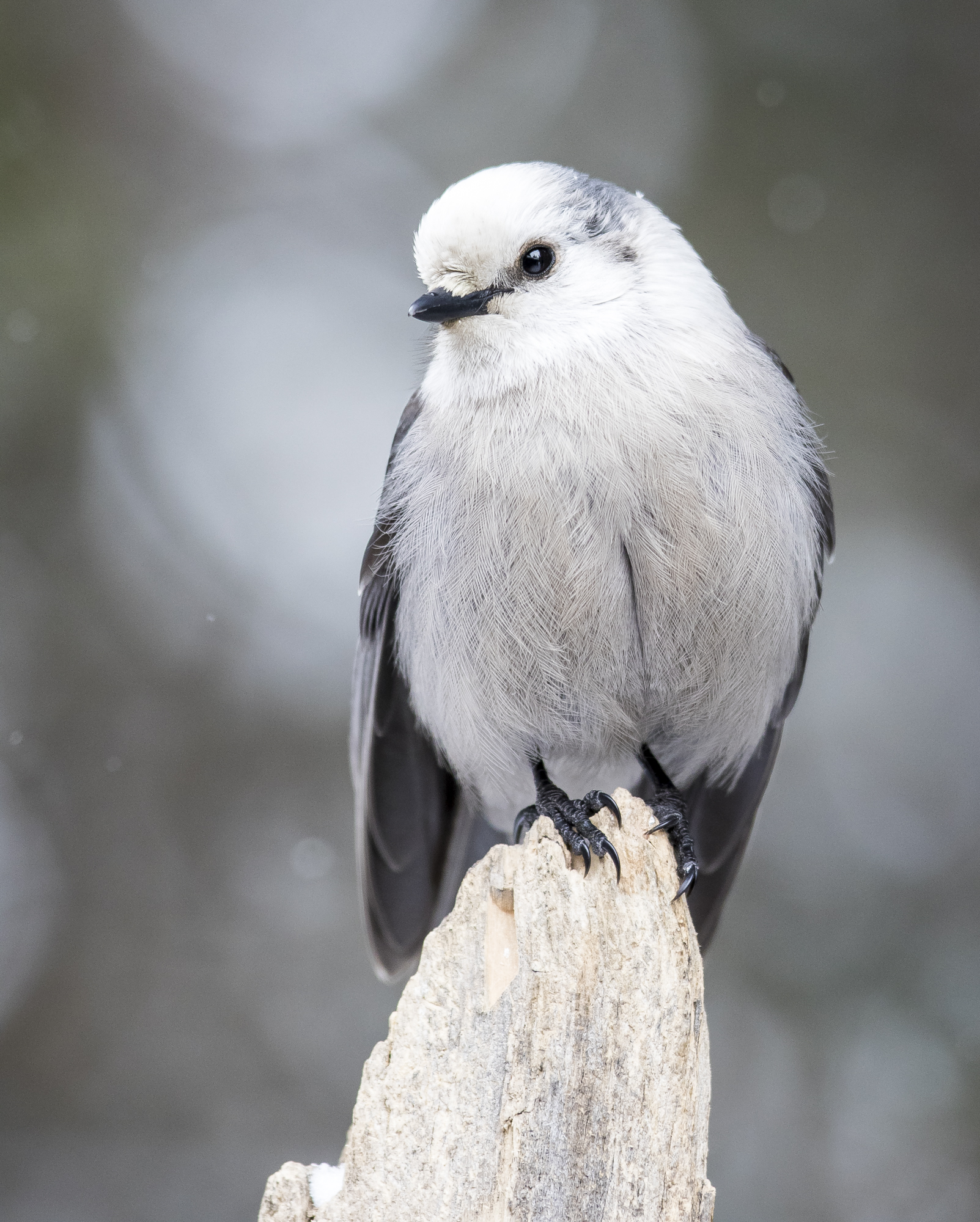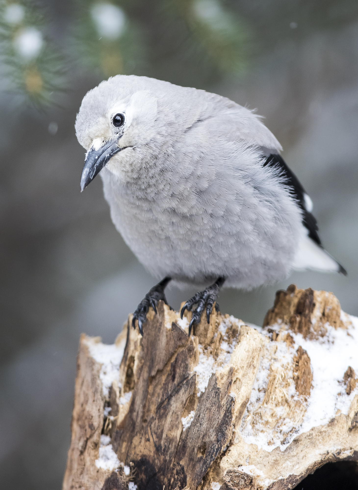 A large bull elk drew a crowd at one point along the road. The down side of a fixed telephoto lens is you may have a hard time fitting it all in the frame if the animal is not off in the distance. A vehicle had run off the road at this point and was trying to shovel out so there was no place to park. We dropped our friends off to enjoy the view of this magnificent bull, drove a ways, turned around and picked them back up in time to see a furloughed park employee helping the stuck vehicle out of the ditch. In Silver Gate, I grabbed my camera as we walked up to our friends’ house as they often have a great variety of birds at their feeders in winter.